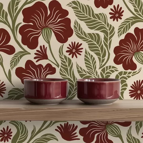 Tapet Bourgognefärgade blommor med gröna blad på ljus bakgrund Nr. a00761