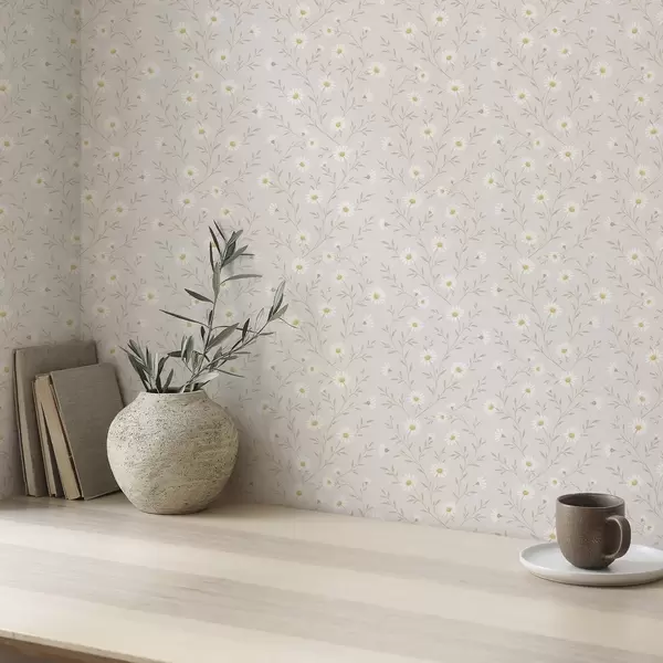 Tapet Små prästkragar på kvistar, varm beige Nr. a00777