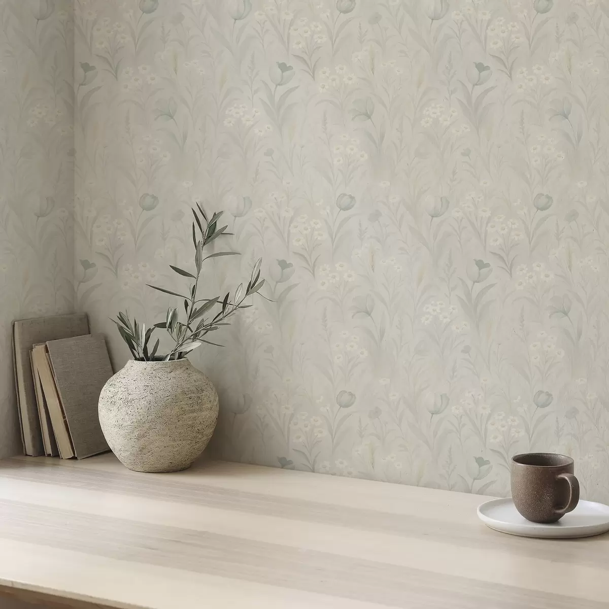Tapet Mild äng med tulpaner och prästkragar, pastellfärgad salvia Nr. a00779