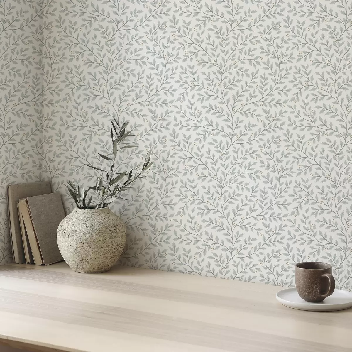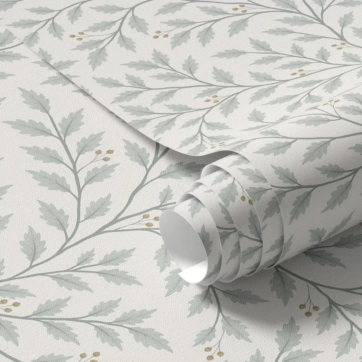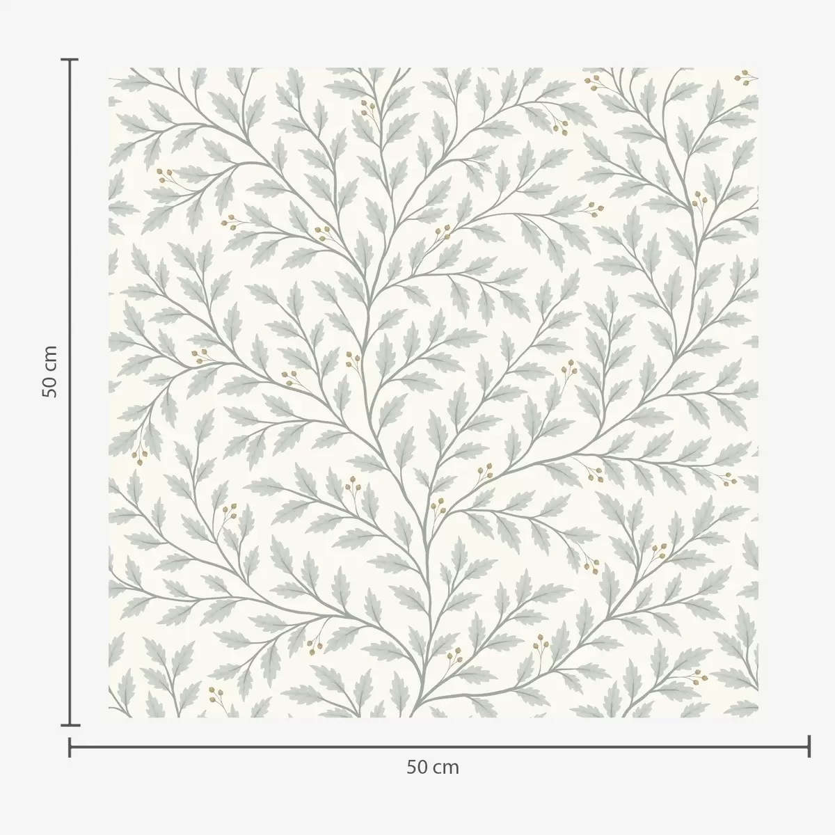 Tapet Grenar med blad och bär, ljus kräm och salvia Nr. a00783