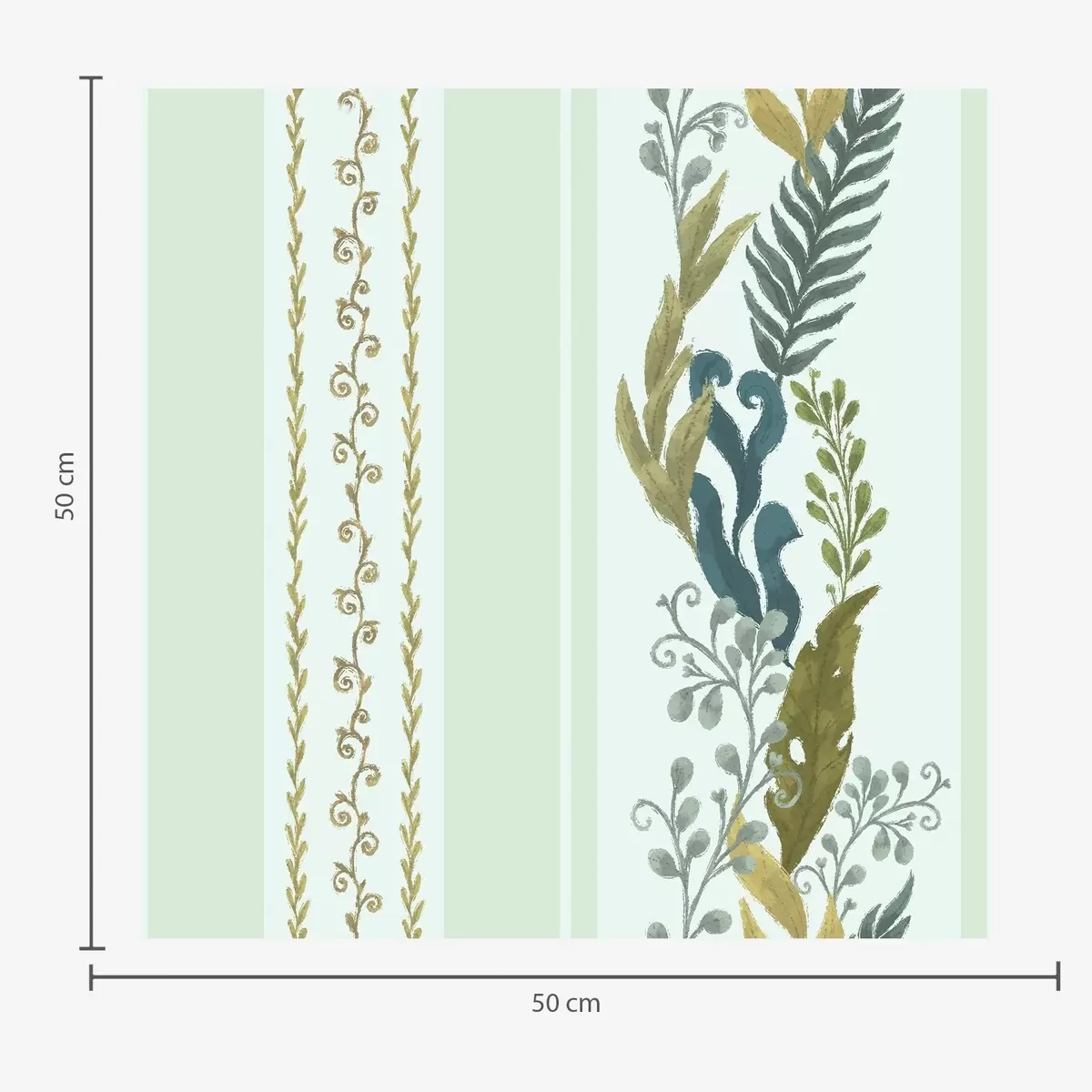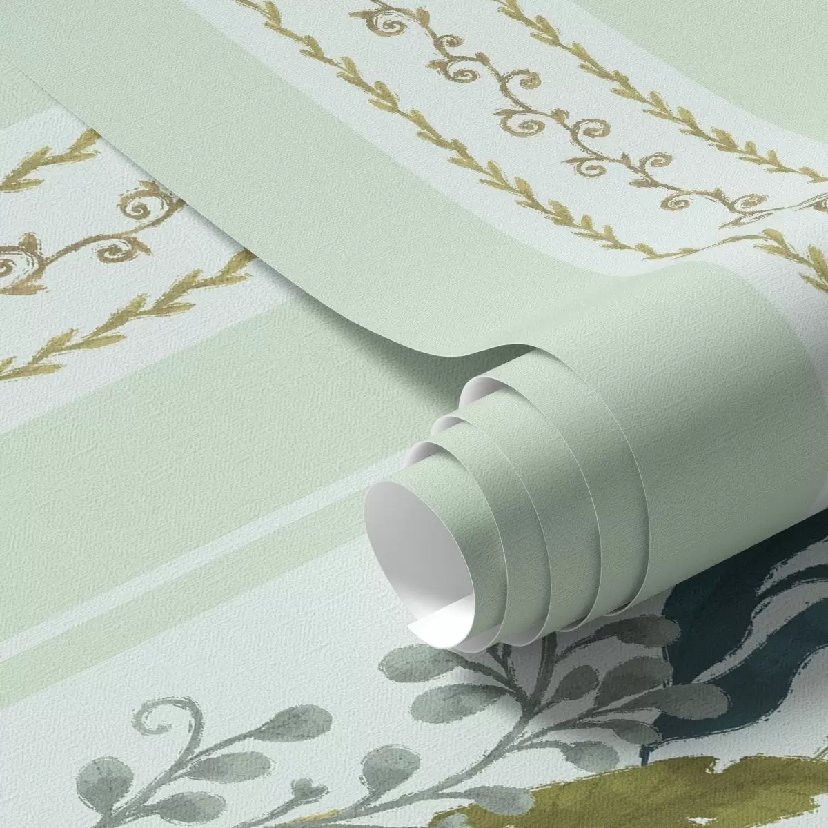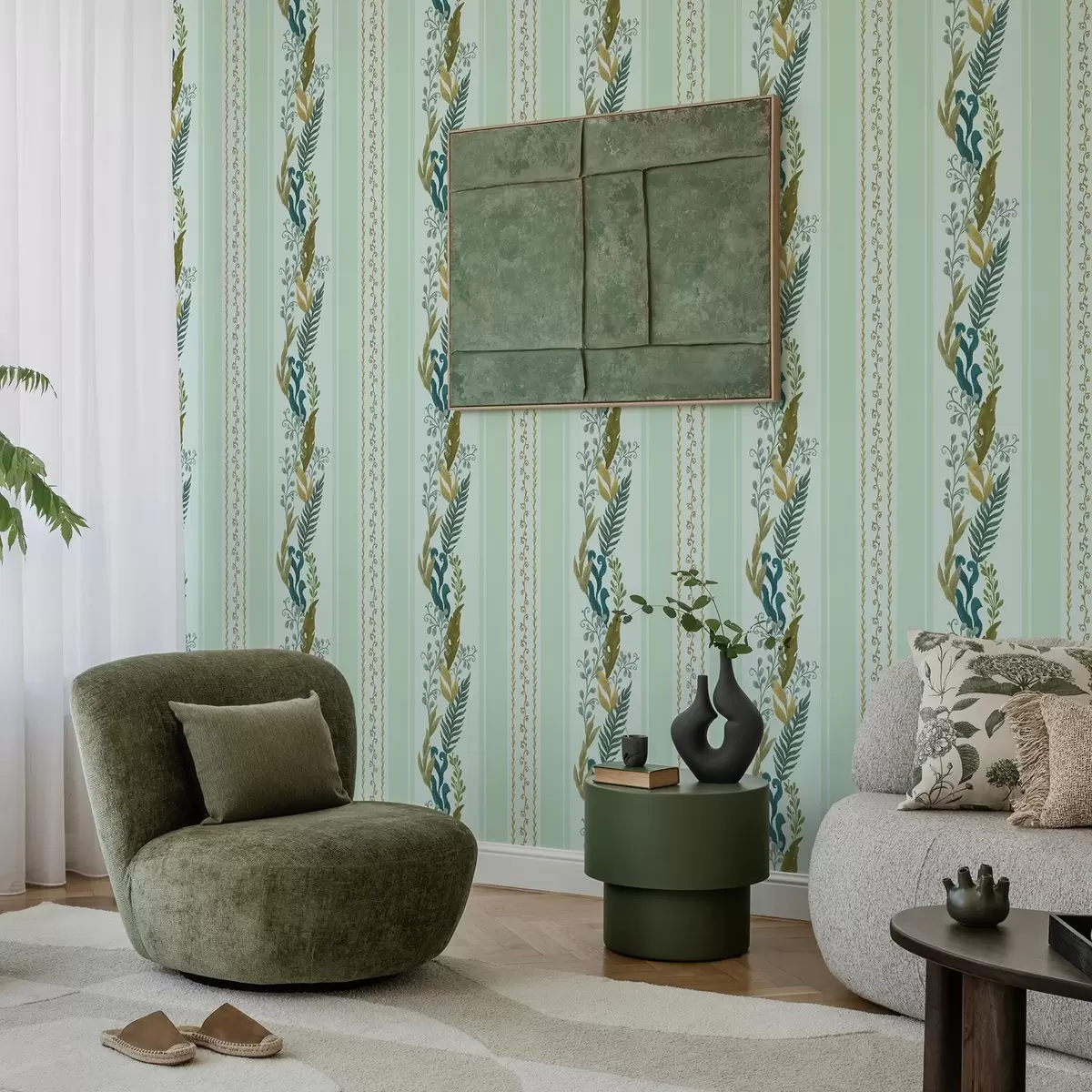 Tapet Breda ränder med måleriska grenar på mjuk mintgrön bakgrund Nr. a00825v1