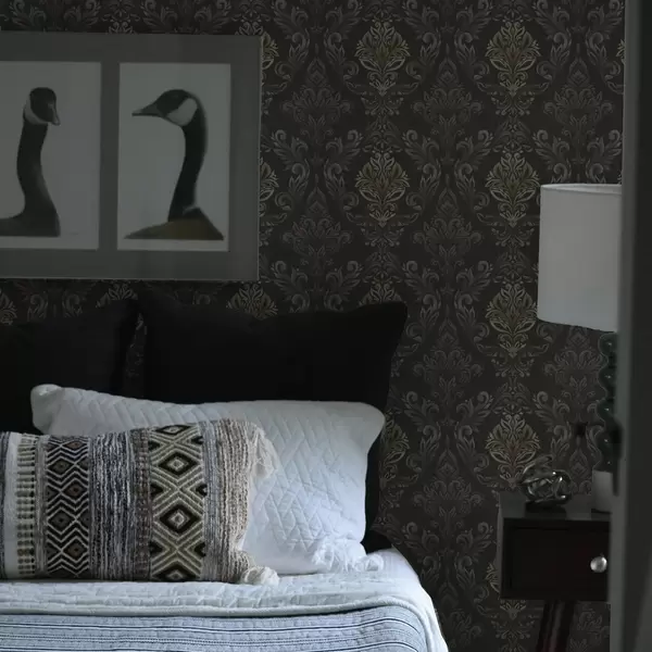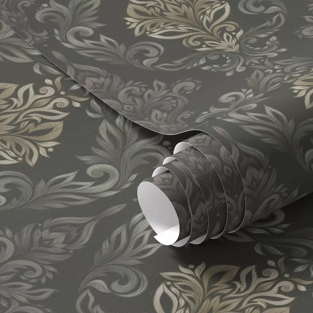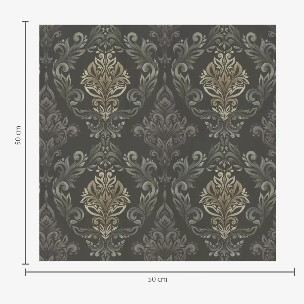 Tapet Damask på mörk grafitbakgrund, accenter i olivockra Nr. a00828v5