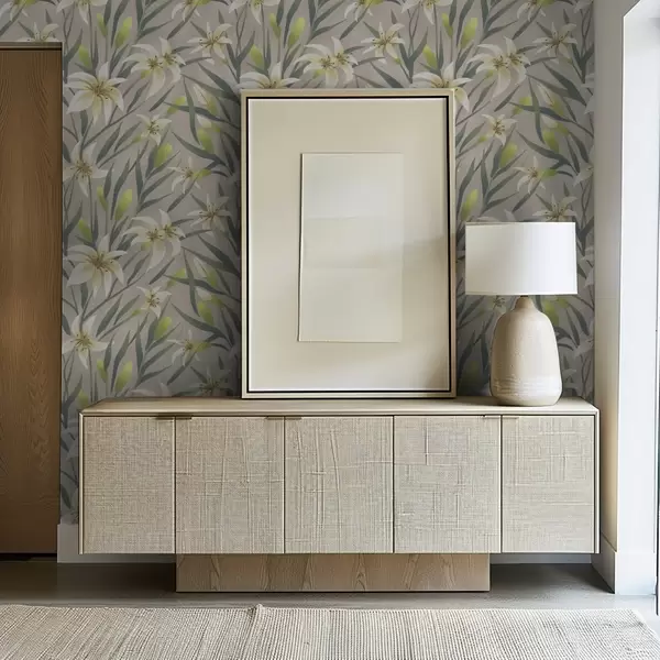 Tapet Krämfärgade liljor med blad på gråbeige bakgrund Nr. a00837