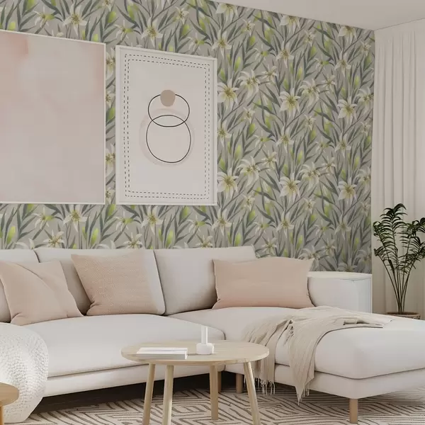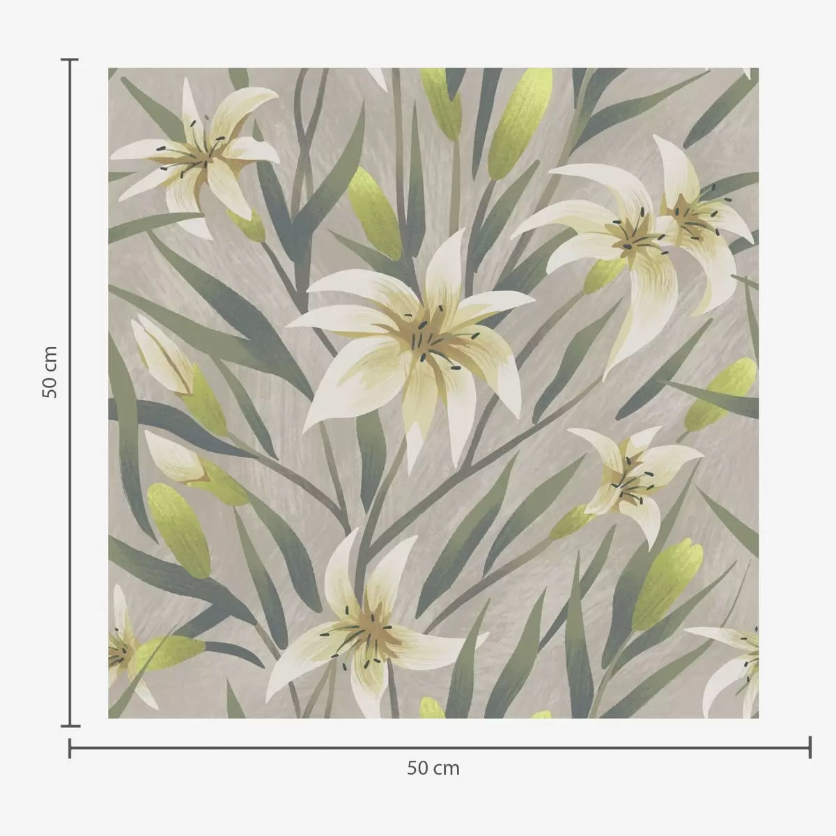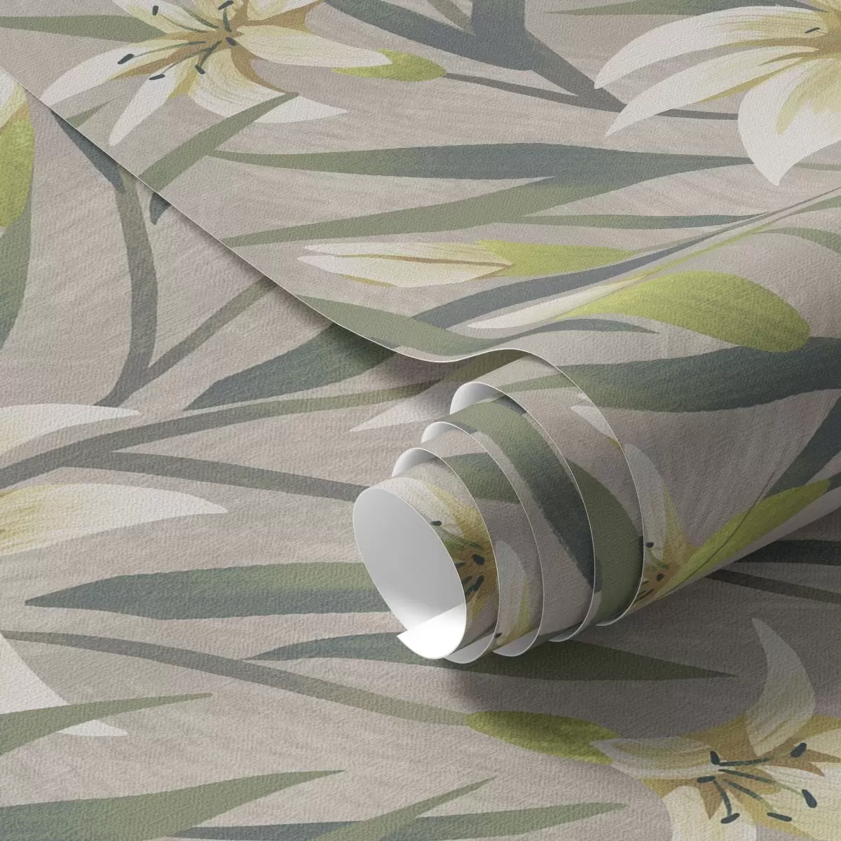 Tapet Krämfärgade liljor med blad på gråbeige bakgrund Nr. a00837