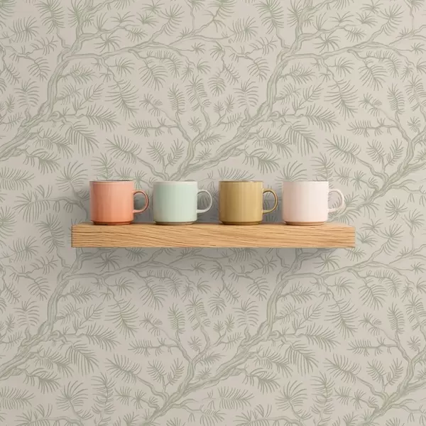 Tapet Tallgrenar i ljusgröna toner på beige bakgrund Nr. a00838v1