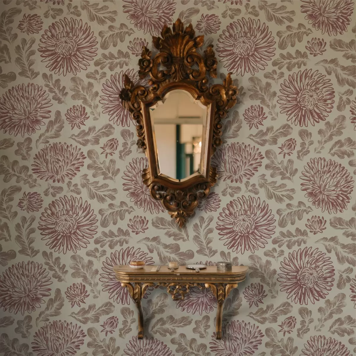 Tapet Krysantemum med vinaccenter på krämfärgat bakgrund Nr. a00840v1