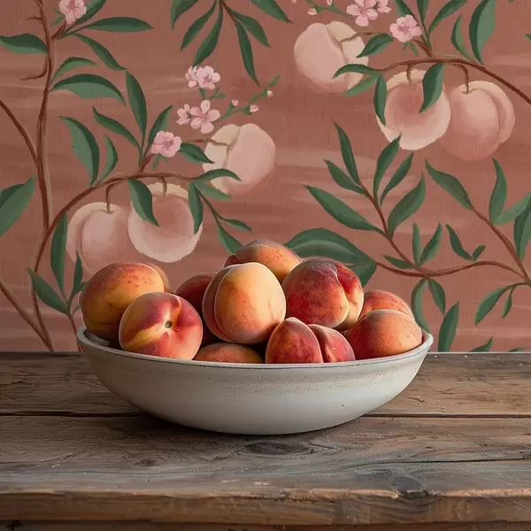Tapet Persikor på grenar med rosa blommor, terrakottafärgad mark Nr. a00856