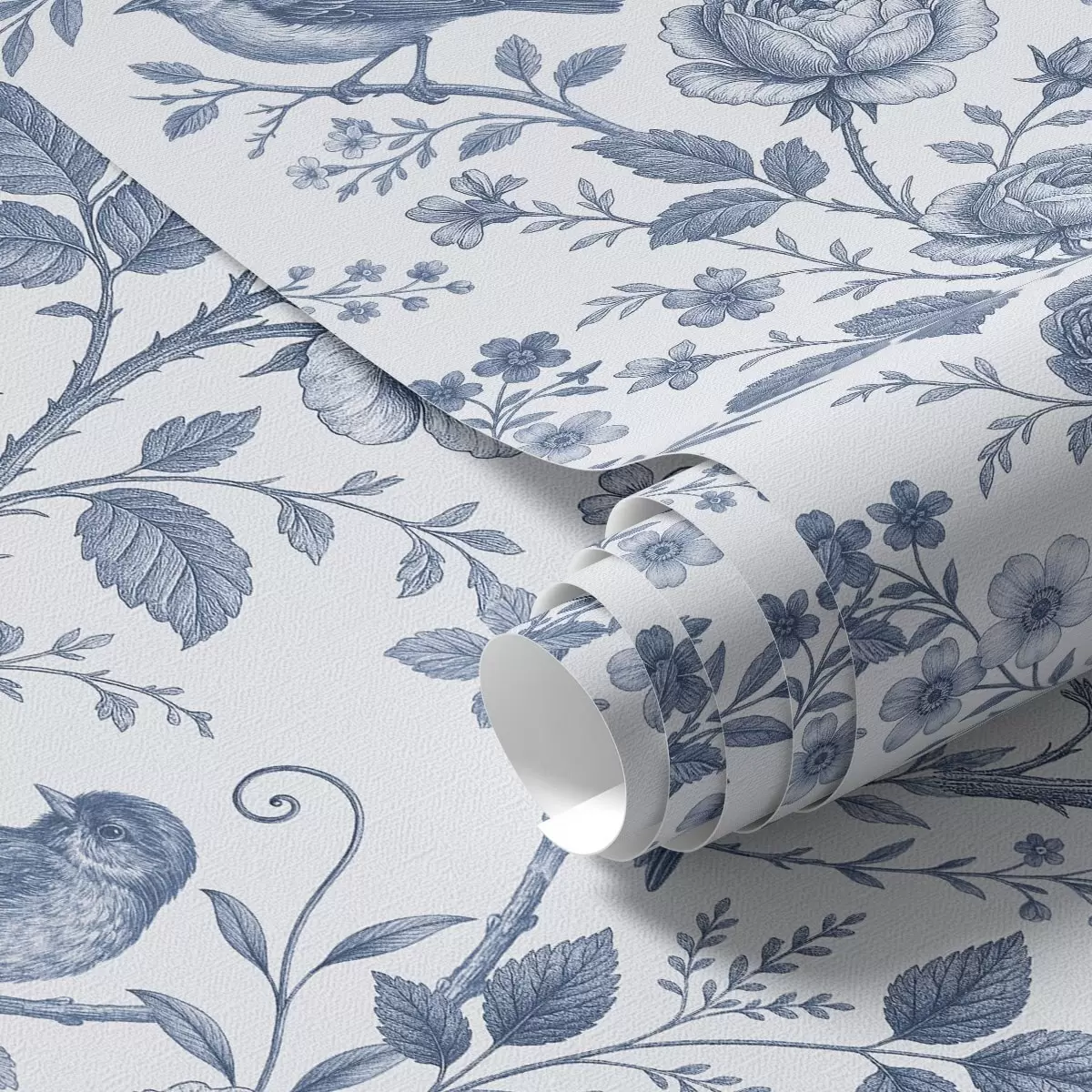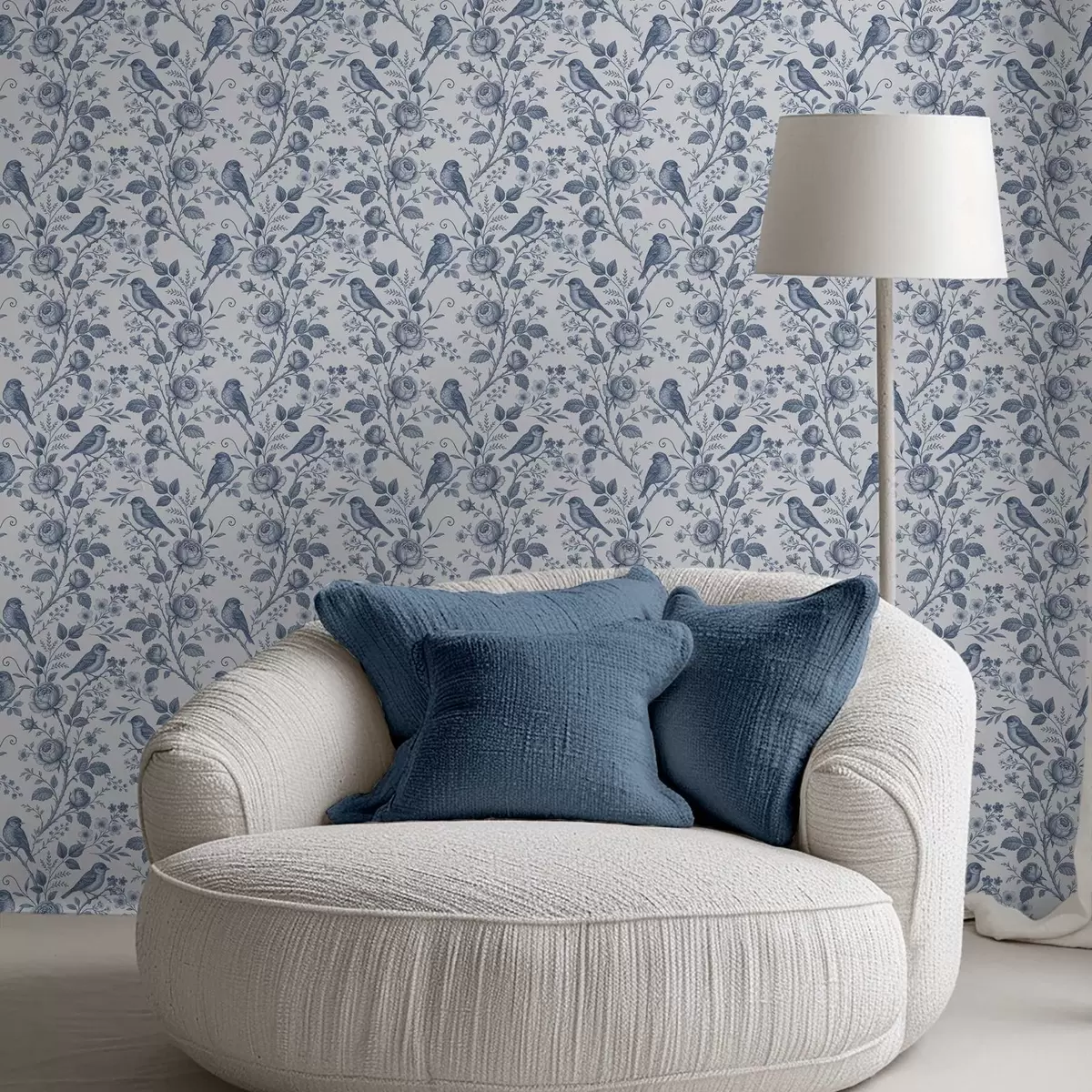 Tapet Blå toile-fåglar och rosor på vitt Nr. a00873