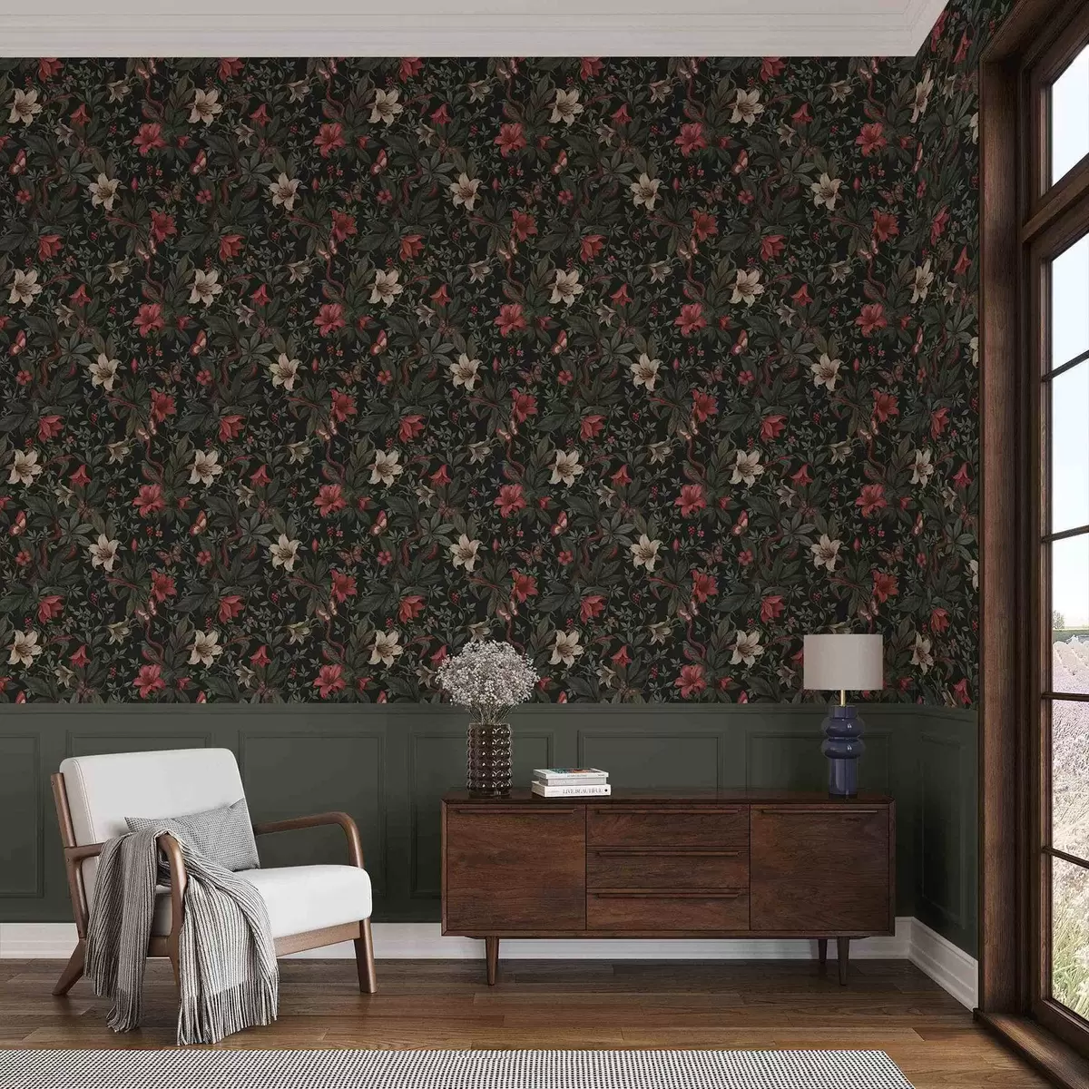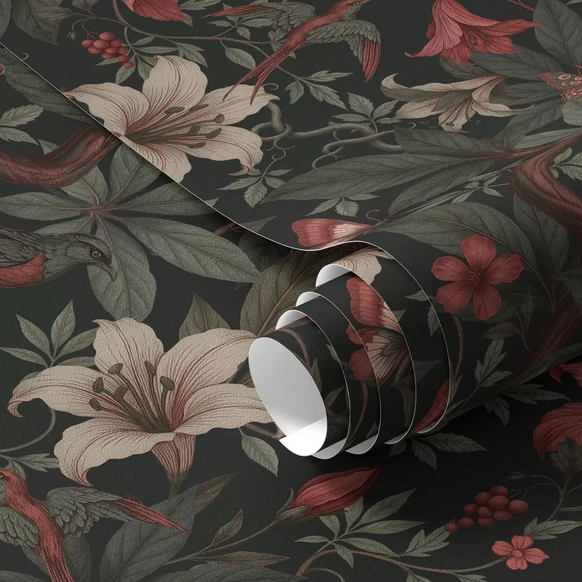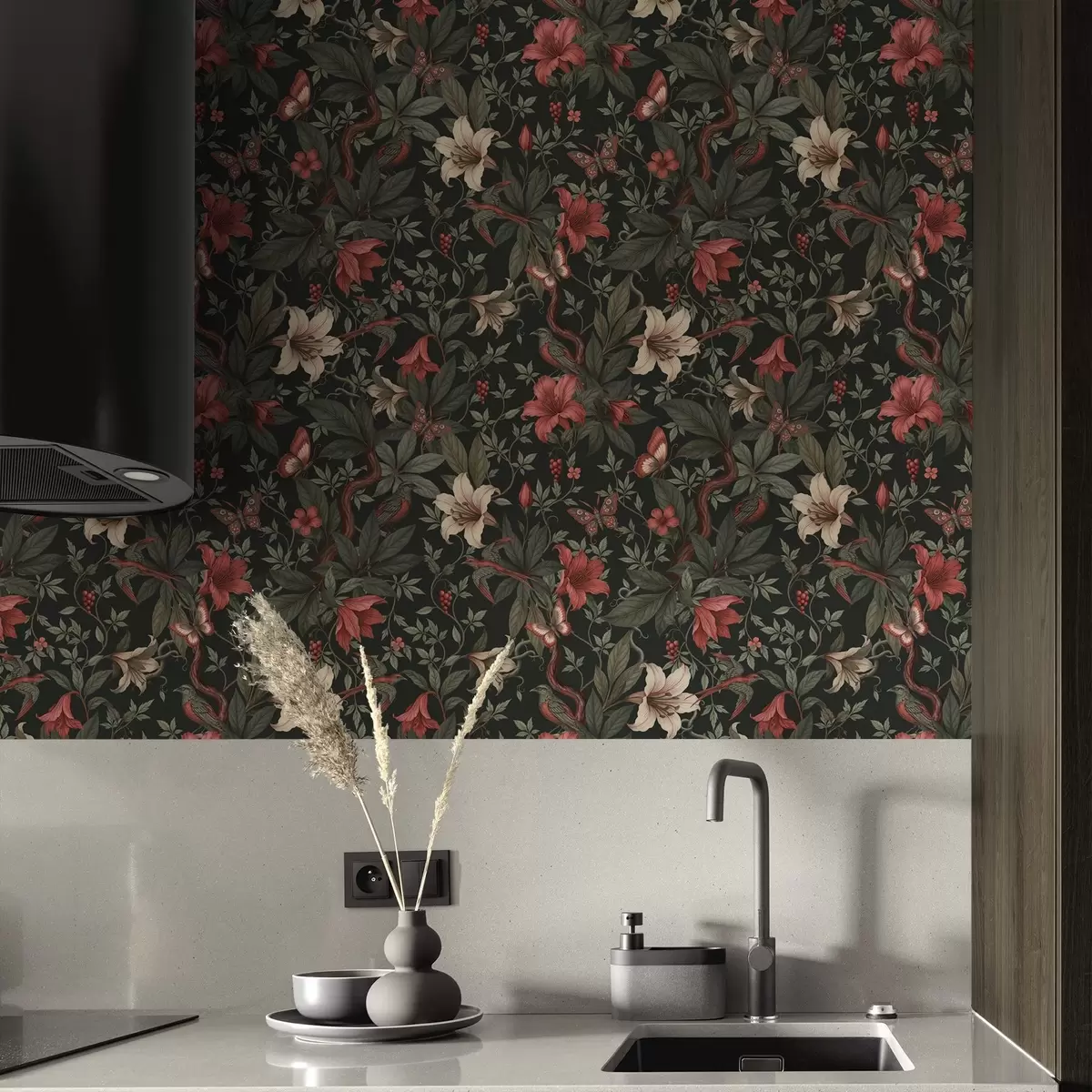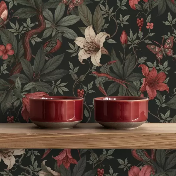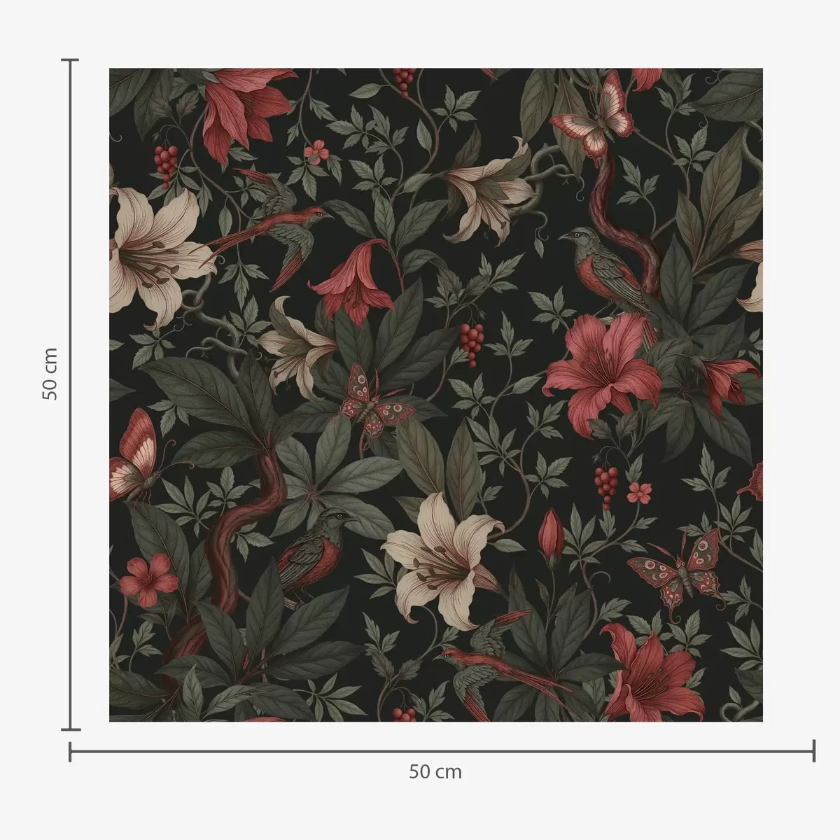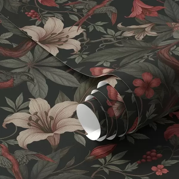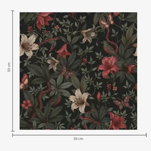 Tapet Mörka djungelblommor med fåglar och fjärilar Nr. a00895