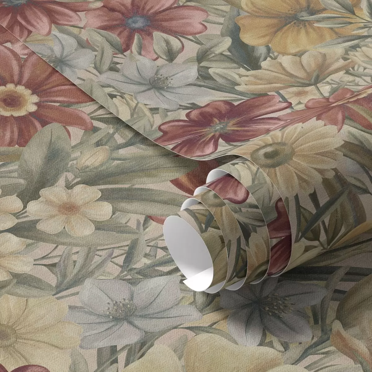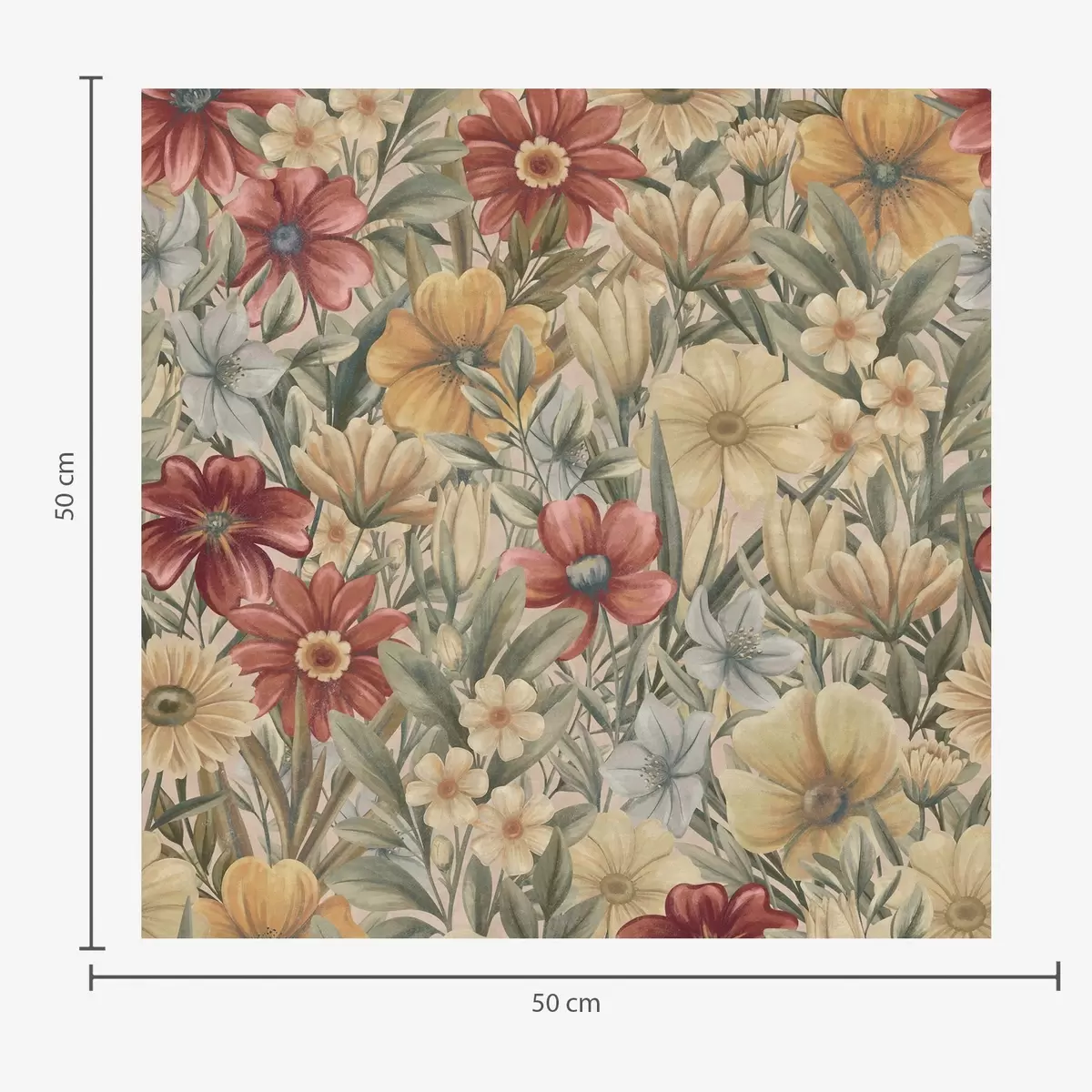 Tapet Vintage ängsblommor i varma gula, röda och salviagröna nyanser Nr. a00906