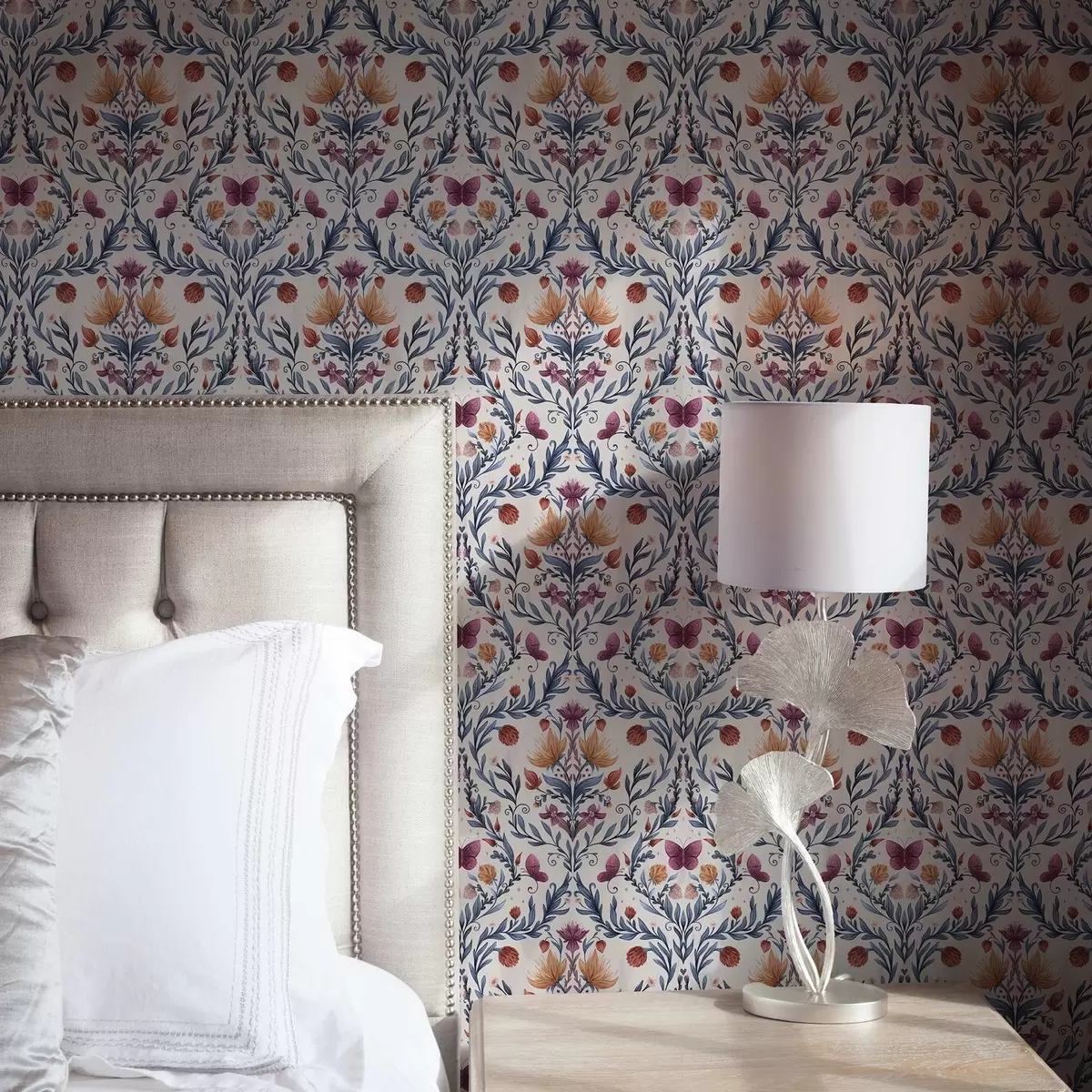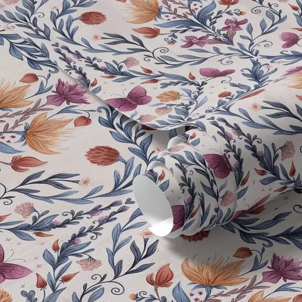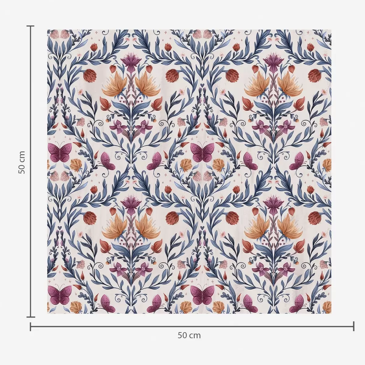 Tapet Blommig damast med fjärilar i marinblått och terrakotta på vitt Nr. a00926v1