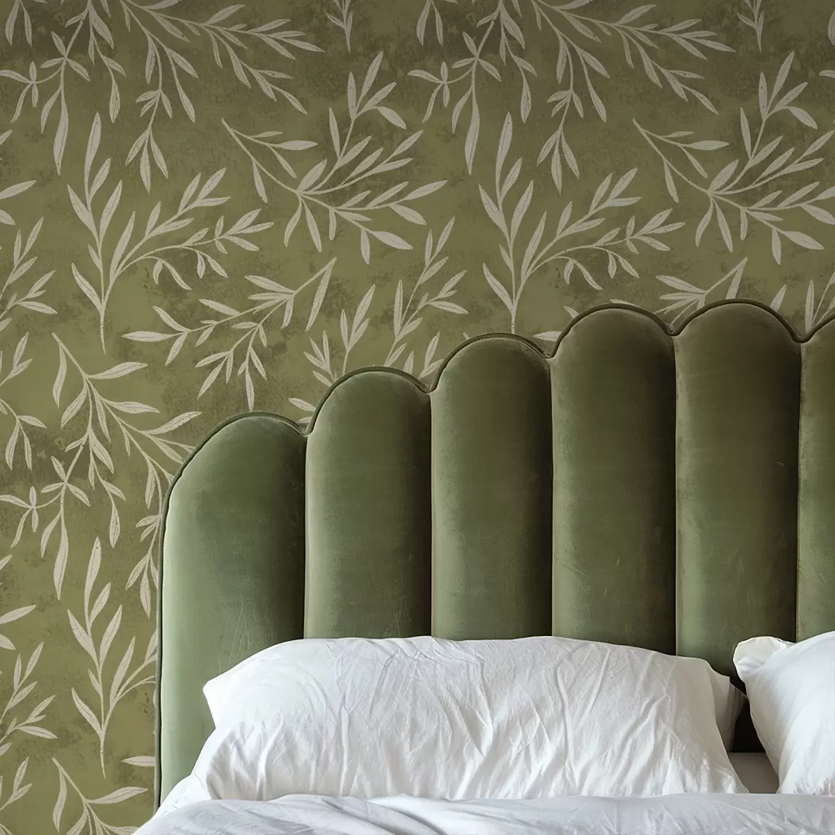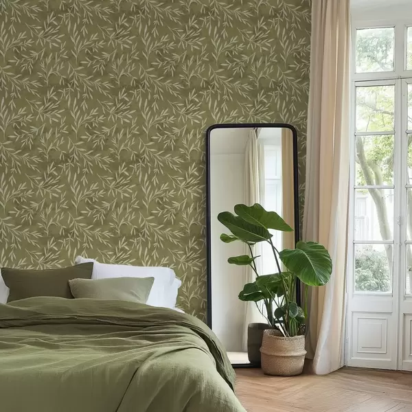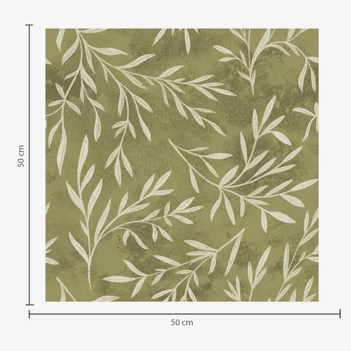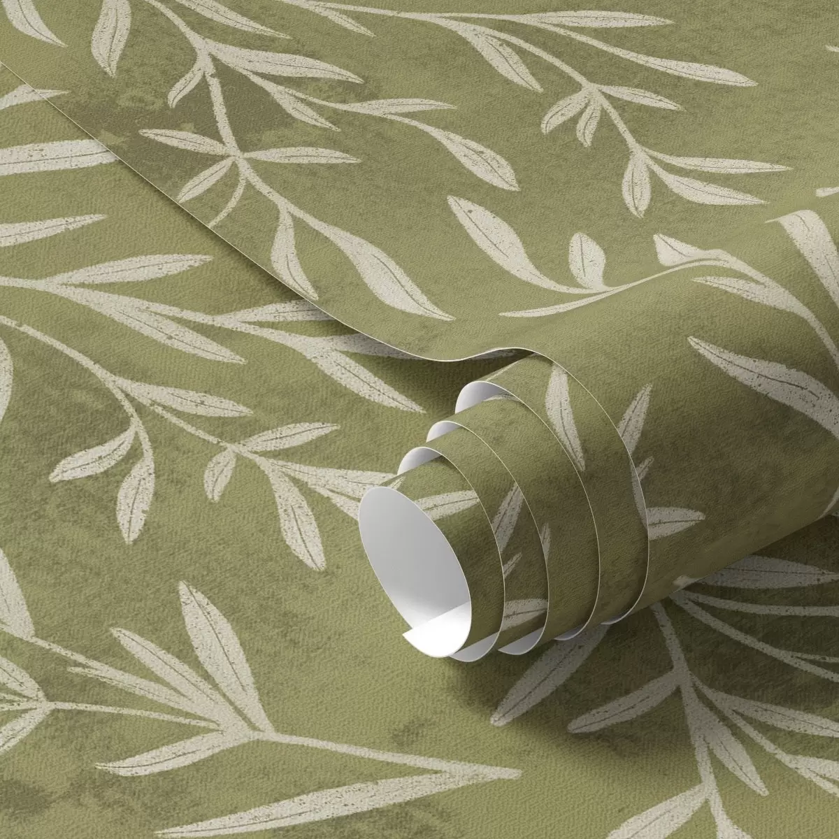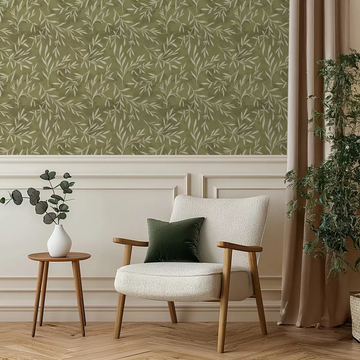 Tapet Krämvita kvistar på en varm olivgrön texturerad bakgrund Nr. a00936v1