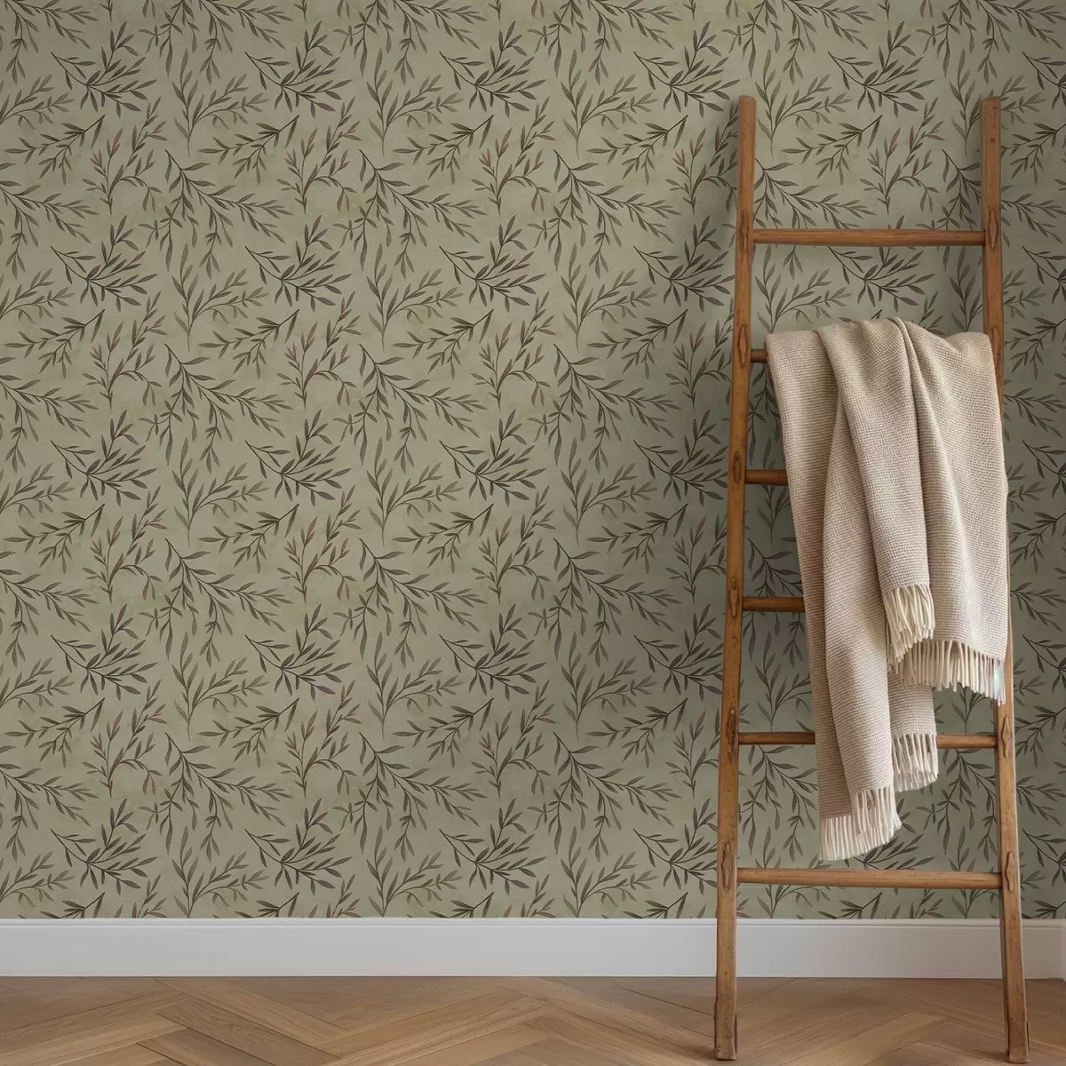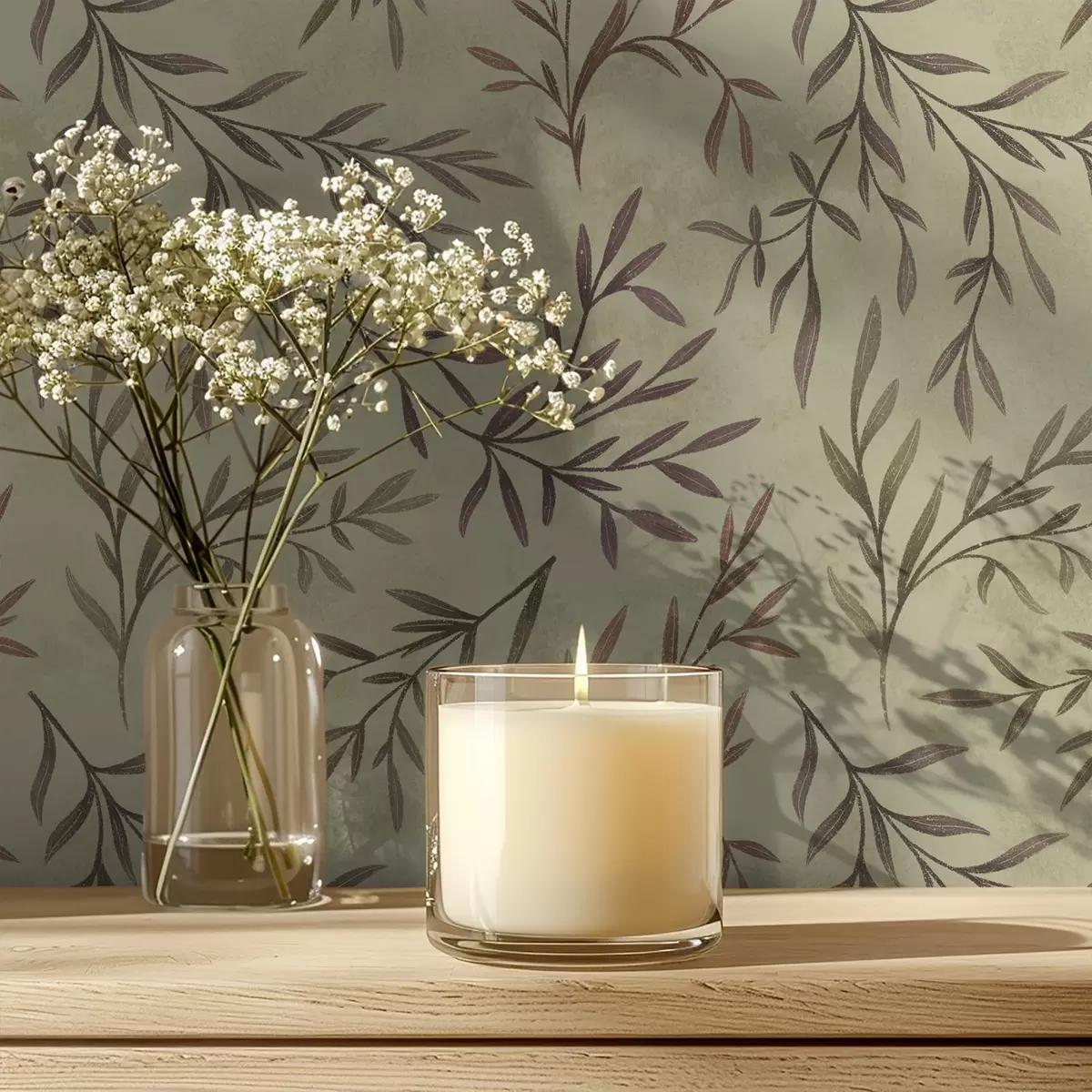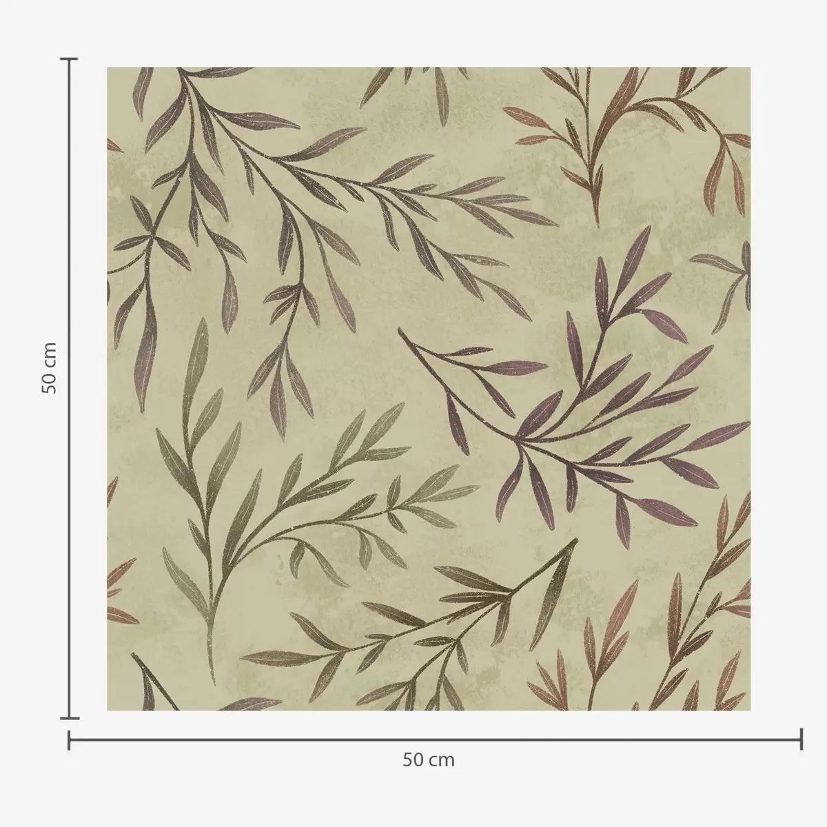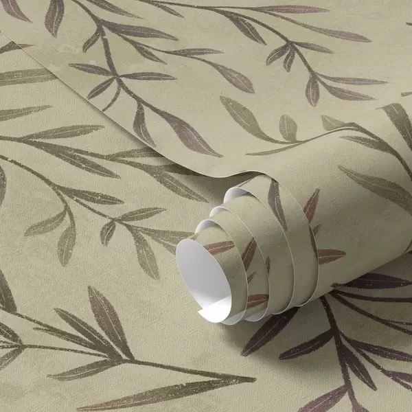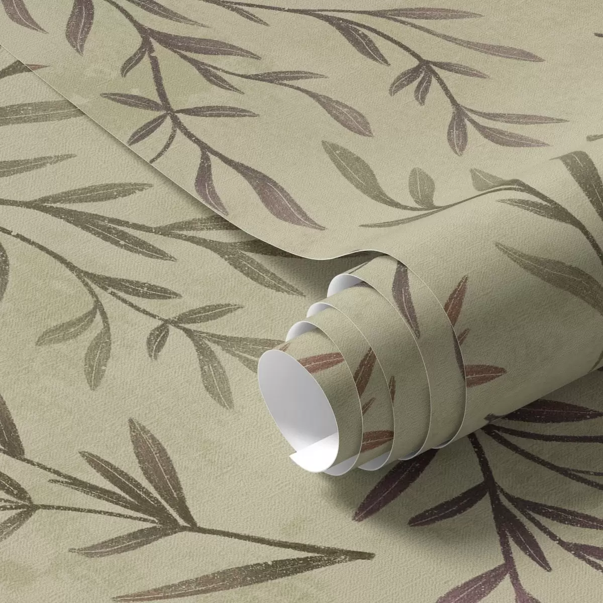Tapet Lila och gröna grenar med blad på en varm bakgrund Nr. a00936v4