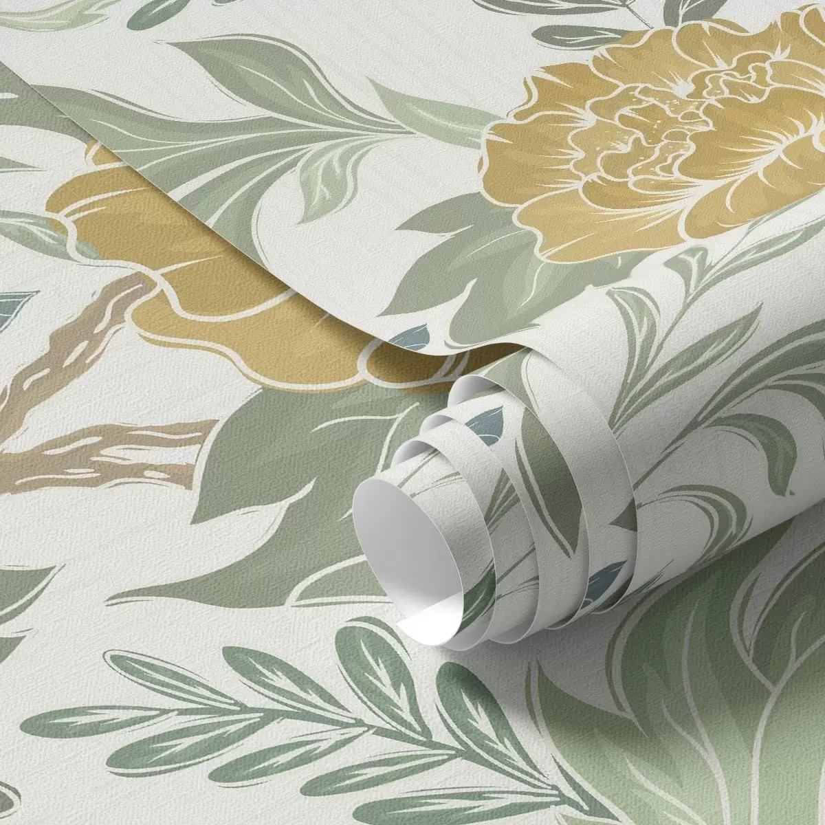 Tapet Stora gula pioner och grönska på ljus bakgrund Nr. a00941