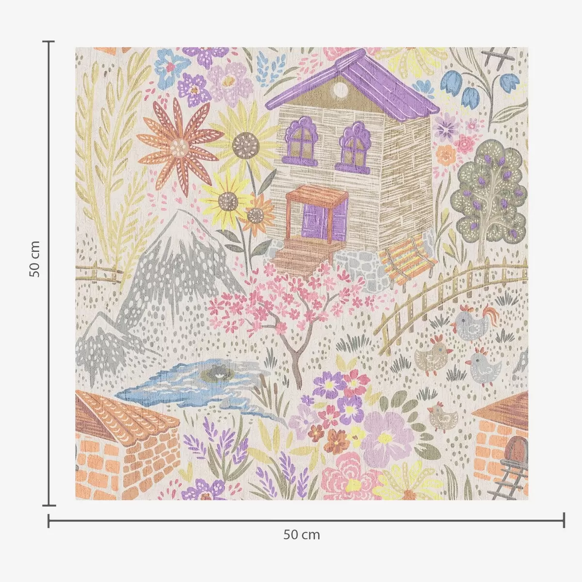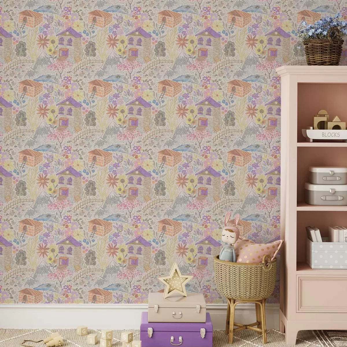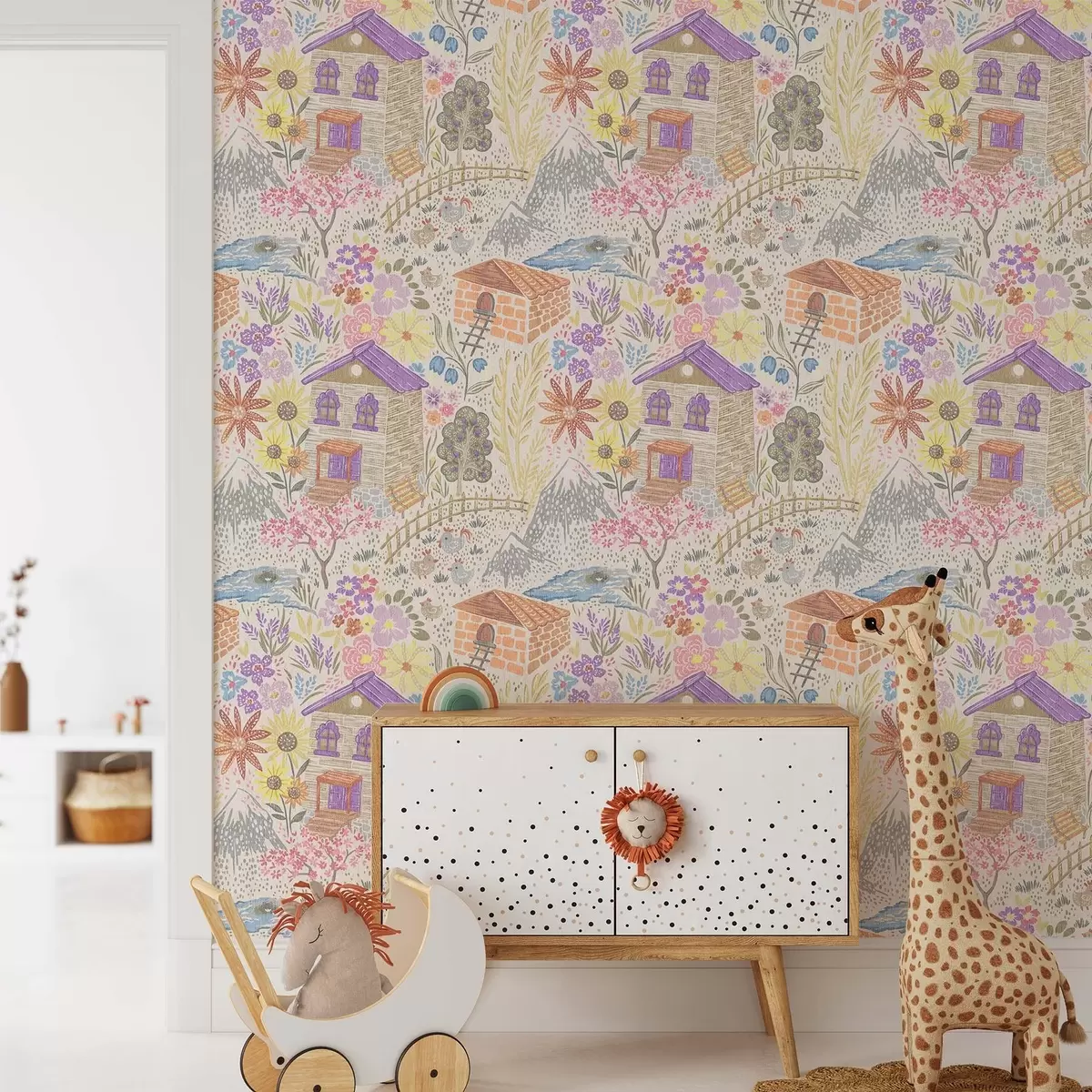 Tapet Barnslig teckning av en by med ett hus, berg och blommor Nr. a00952