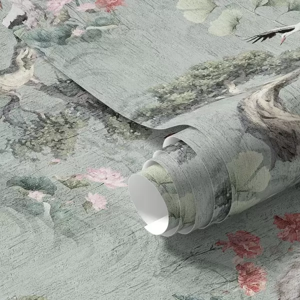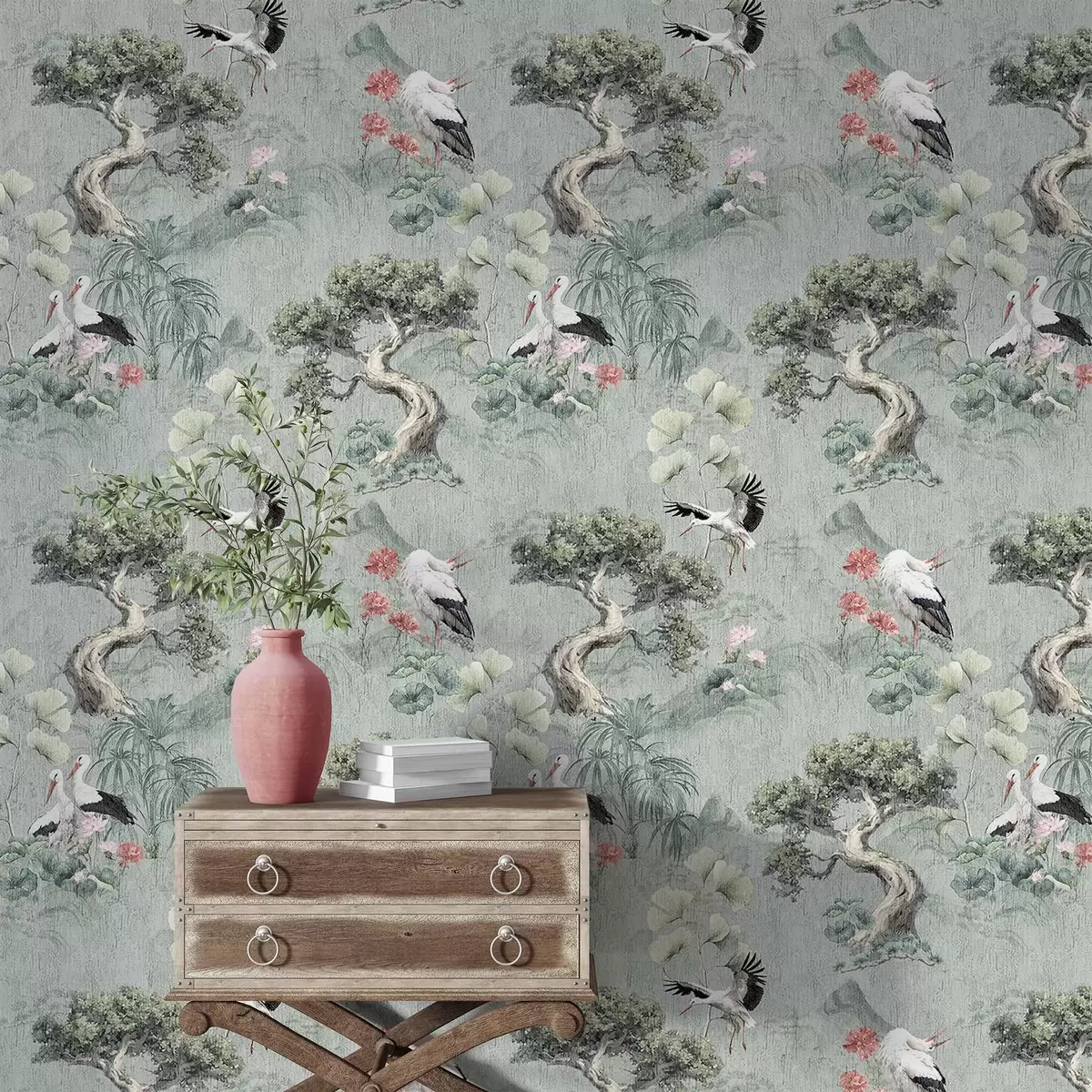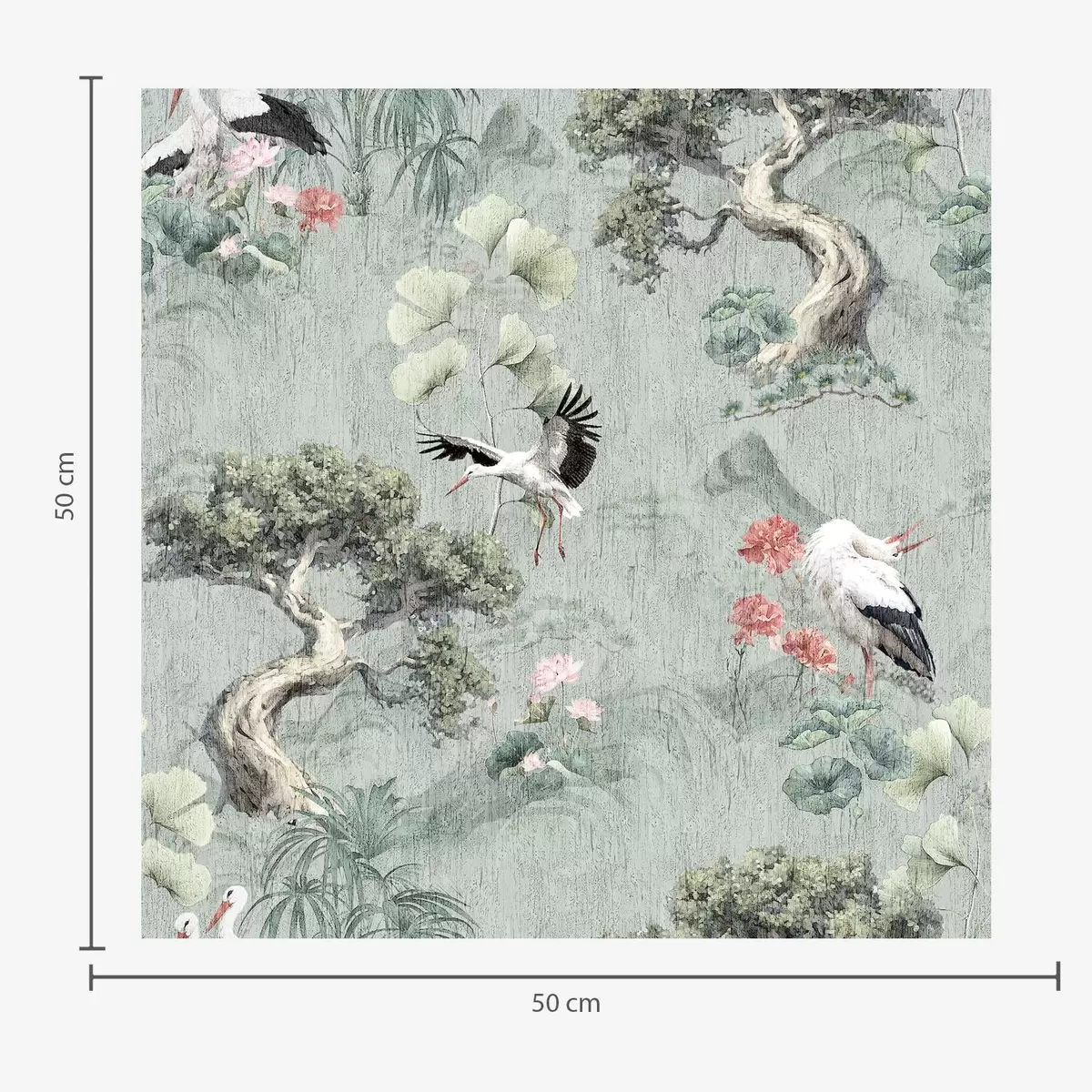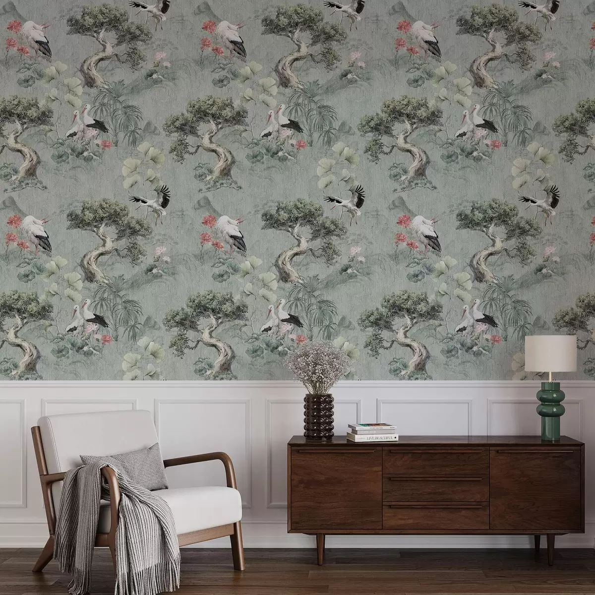 Tapet Kranar bland tallar och lotusblommor på en lugn grön bakgrund Nr. a00962