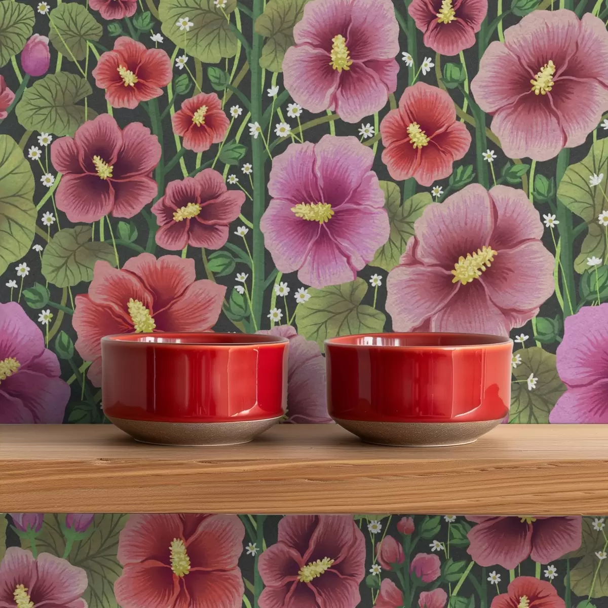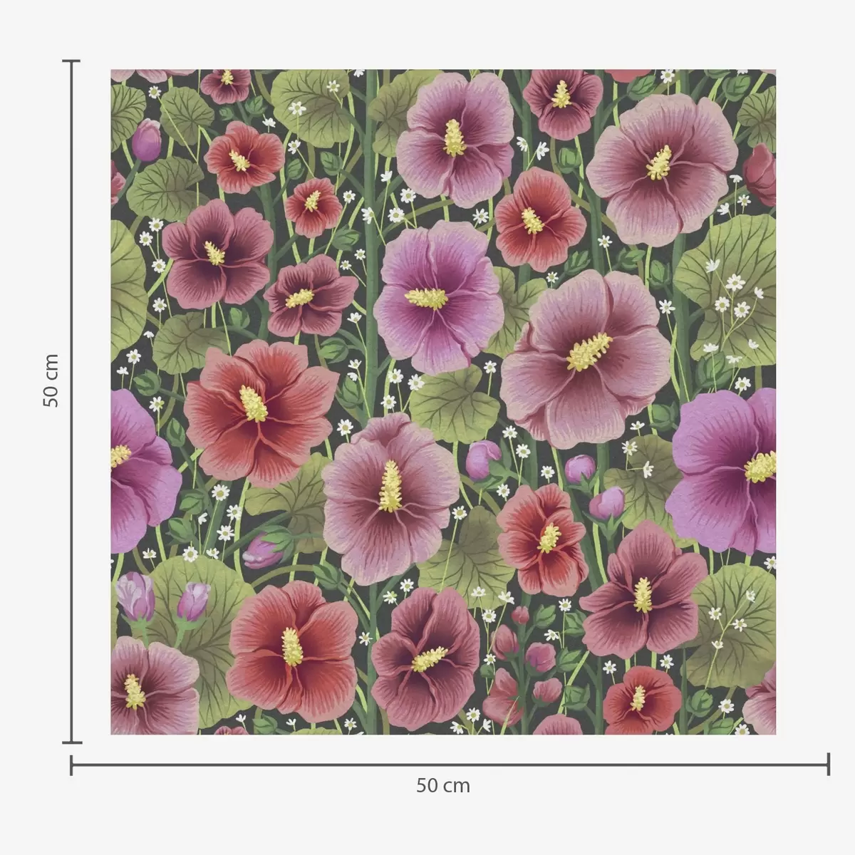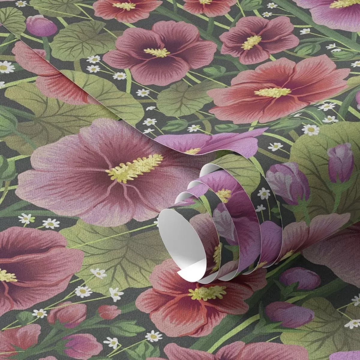 Tapet Ljusa hibiskusblommor och grönska på mörk bakgrund Nr. a00993v2