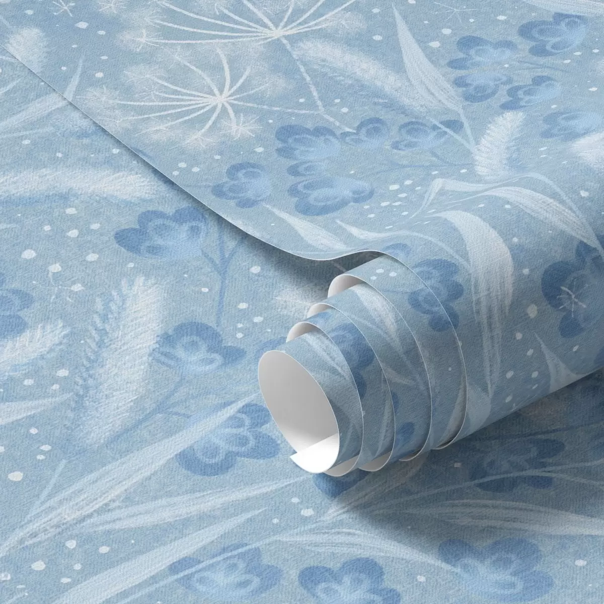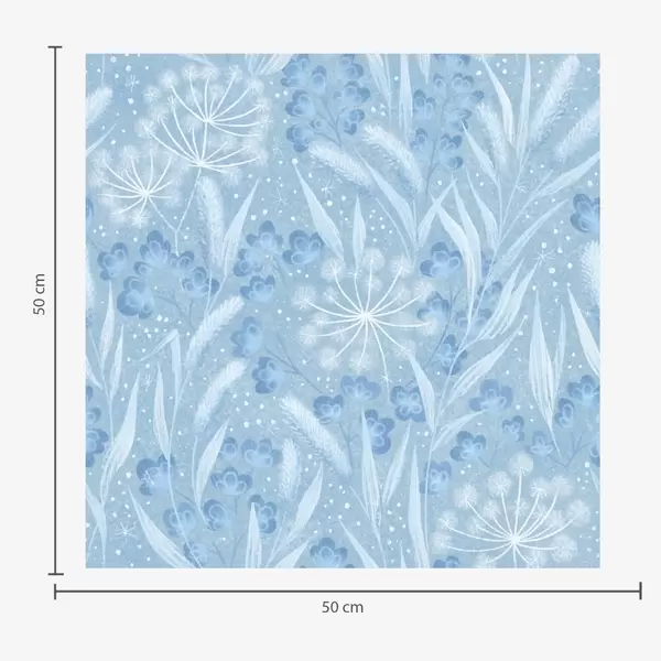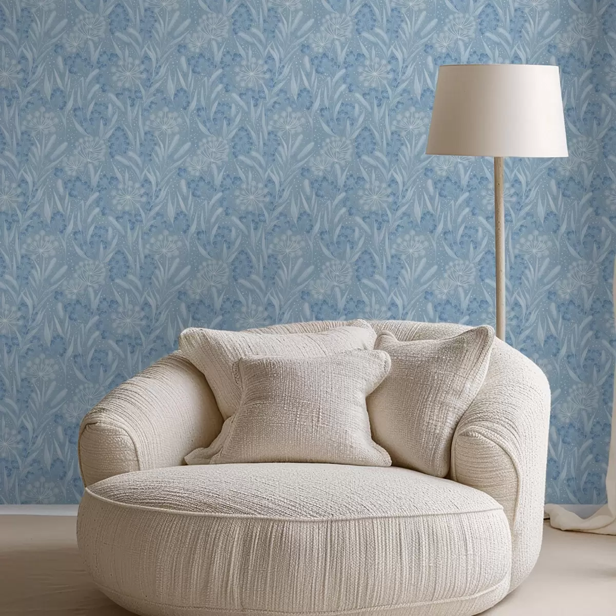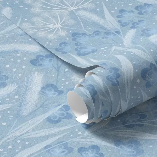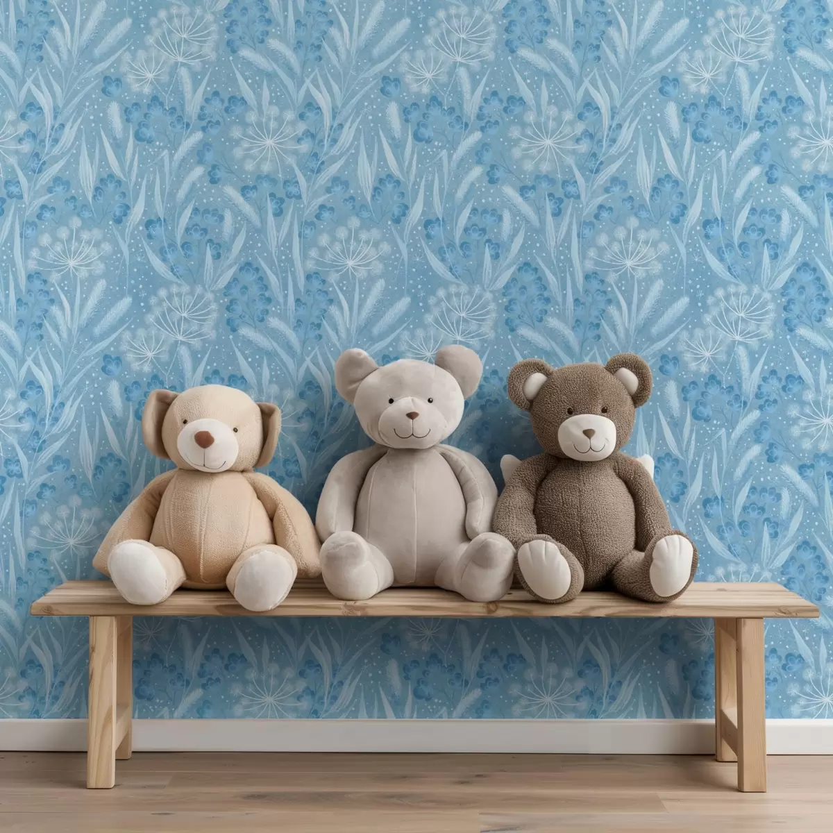 Tapet Frostig blå äng med maskrosfrön och små blommor Nr. a00995
