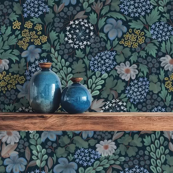 Tapet Nattens trädgård med blå liljor, bär och vild grönska Nr. a00996