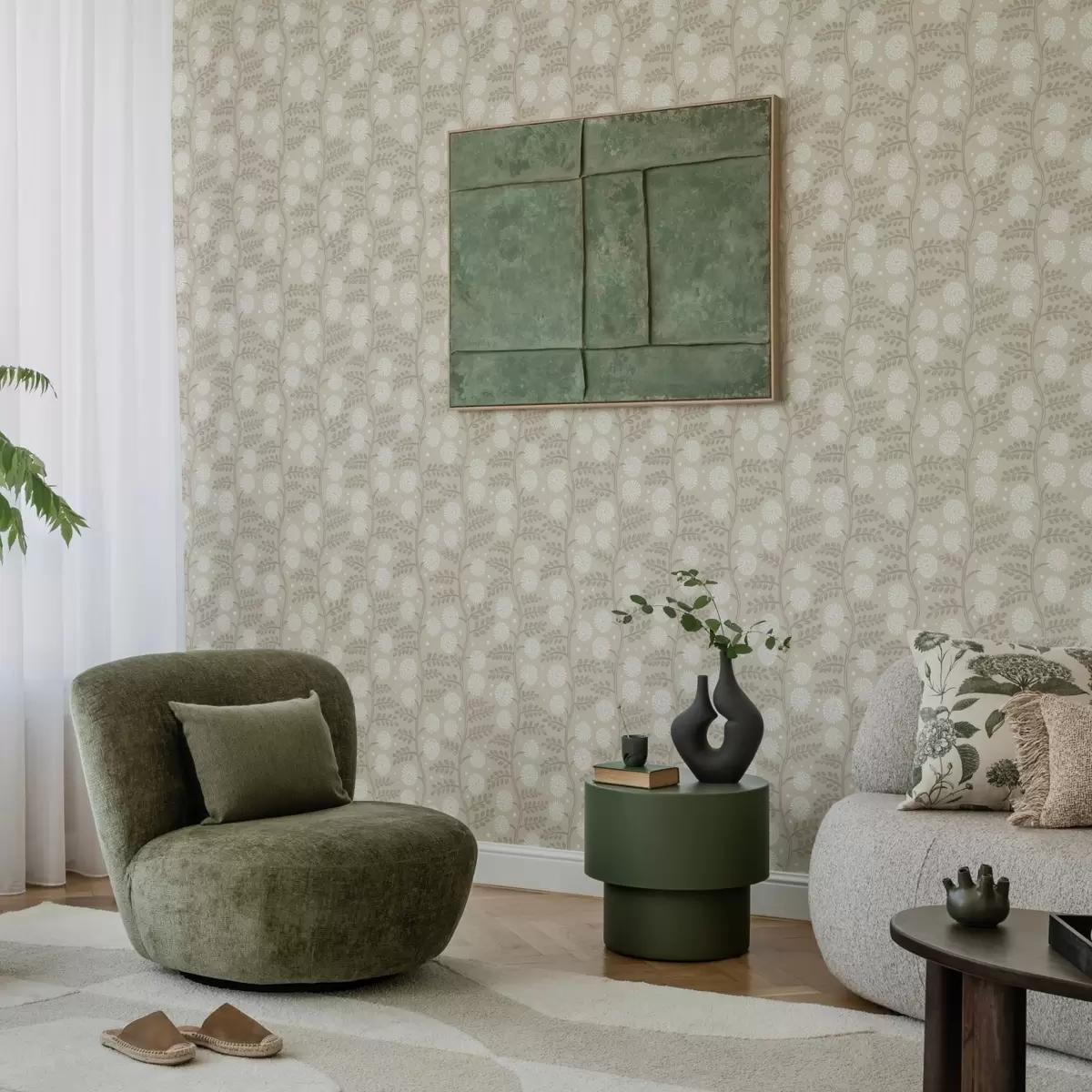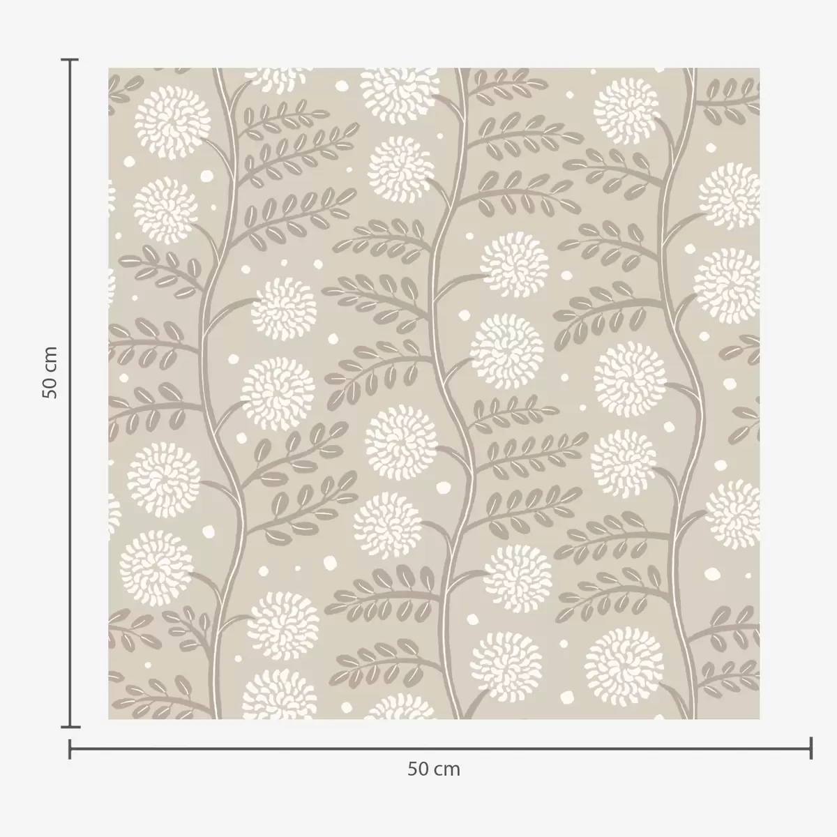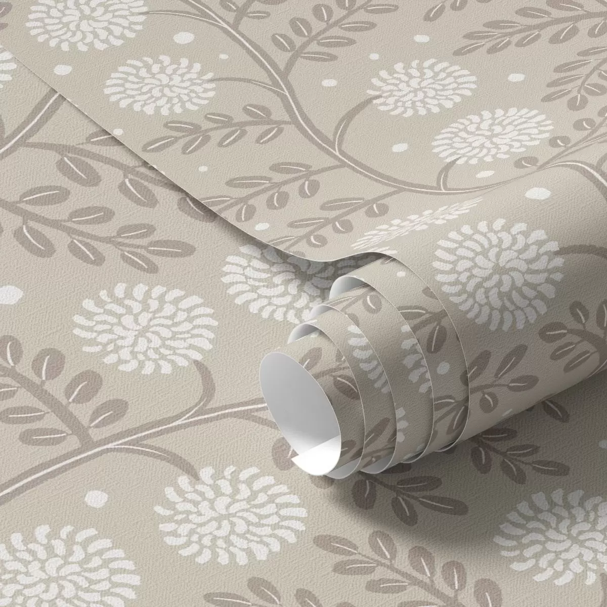 Tapet Beige stjälkar med vita fluffiga blommor och mjuka prickar Nr. a00997