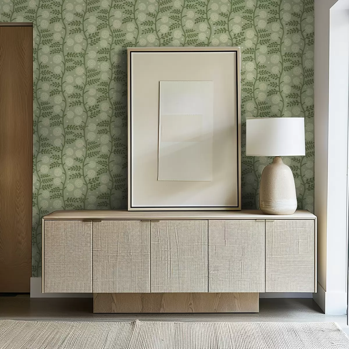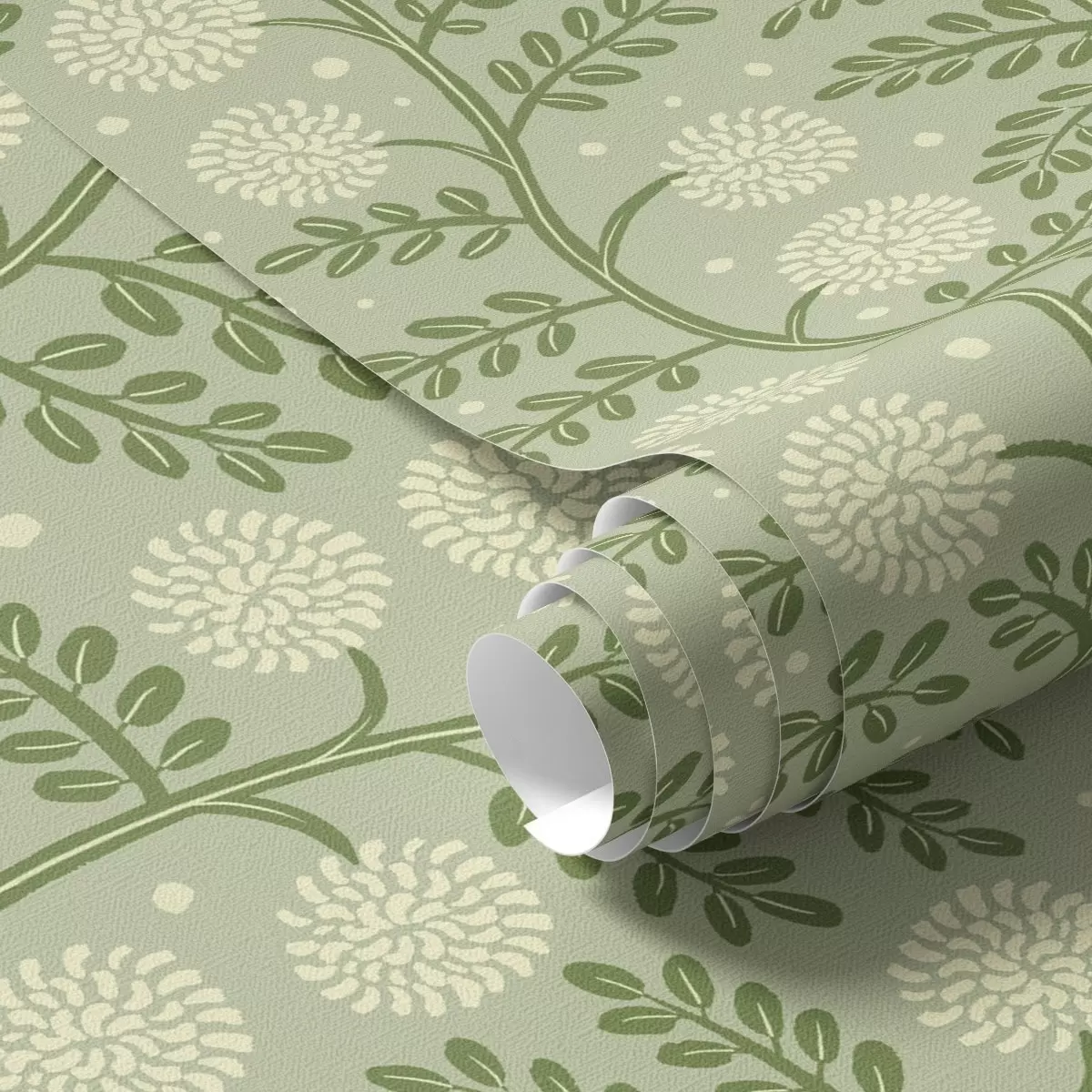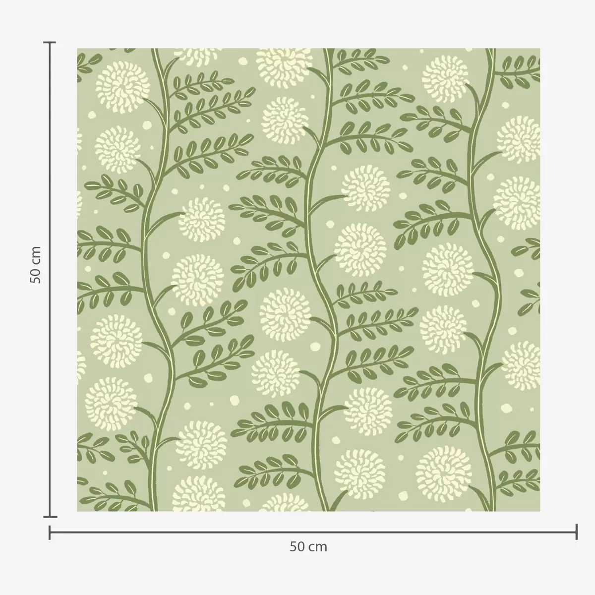 Tapet Salviagröna stjälkar med fluffiga blommor i elfenbensvit och prickar Nr. a00997v2