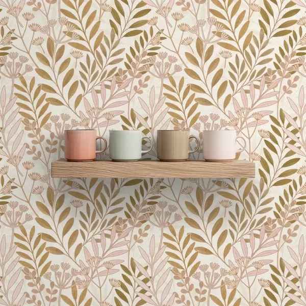 Tapet Lätt botaniskt mönster med delikata rosa och havrefärgade blad Nr. a01020v1