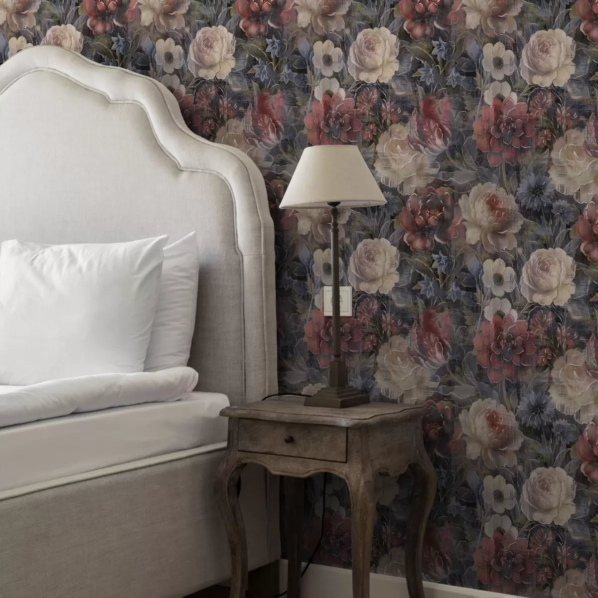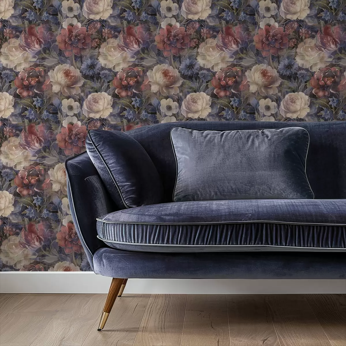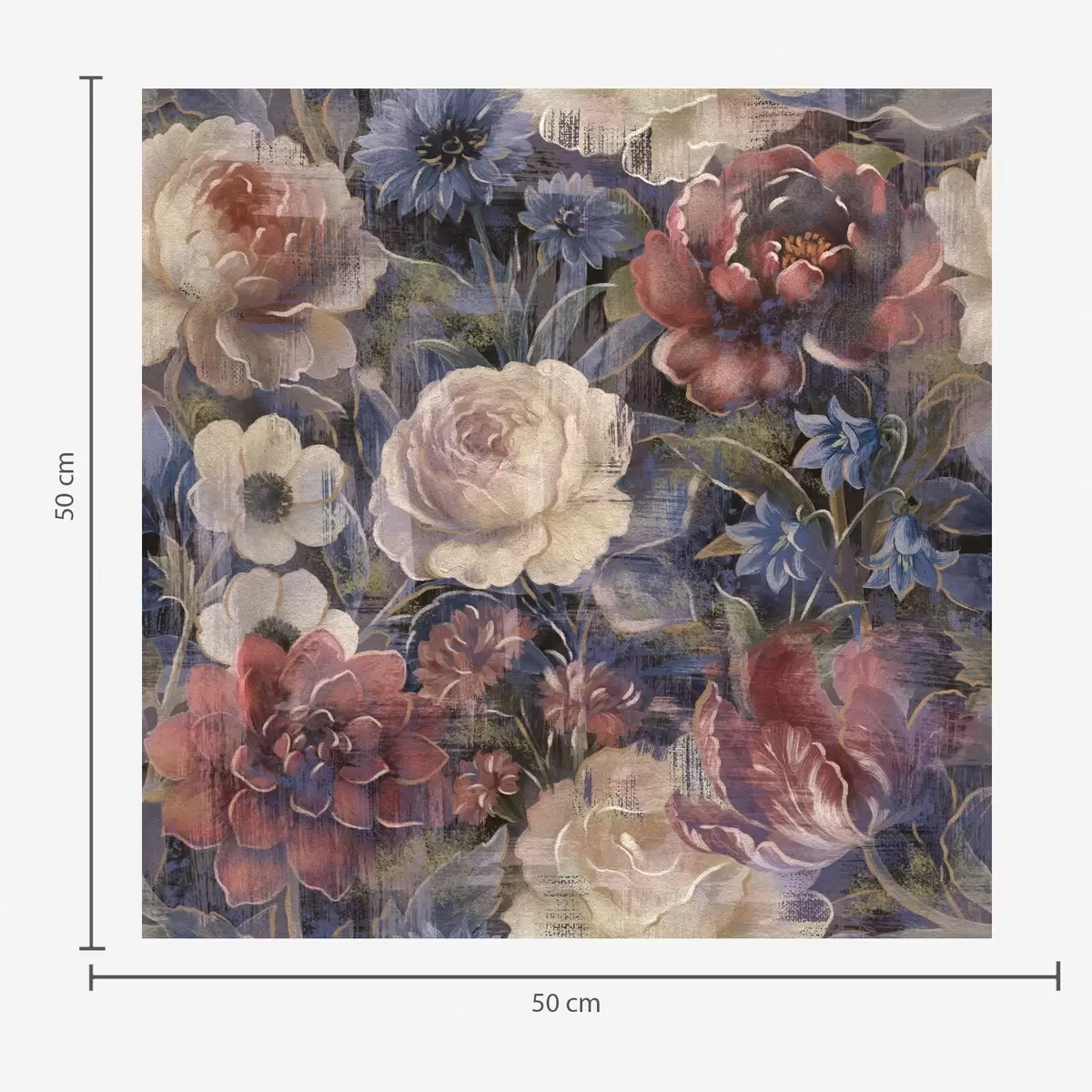 Tapet Målningsliknande bukett med stora blommor på djup indigoblå bakgrund Nr. a01021
