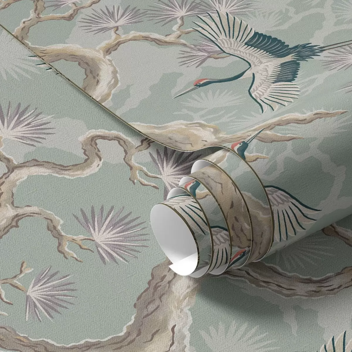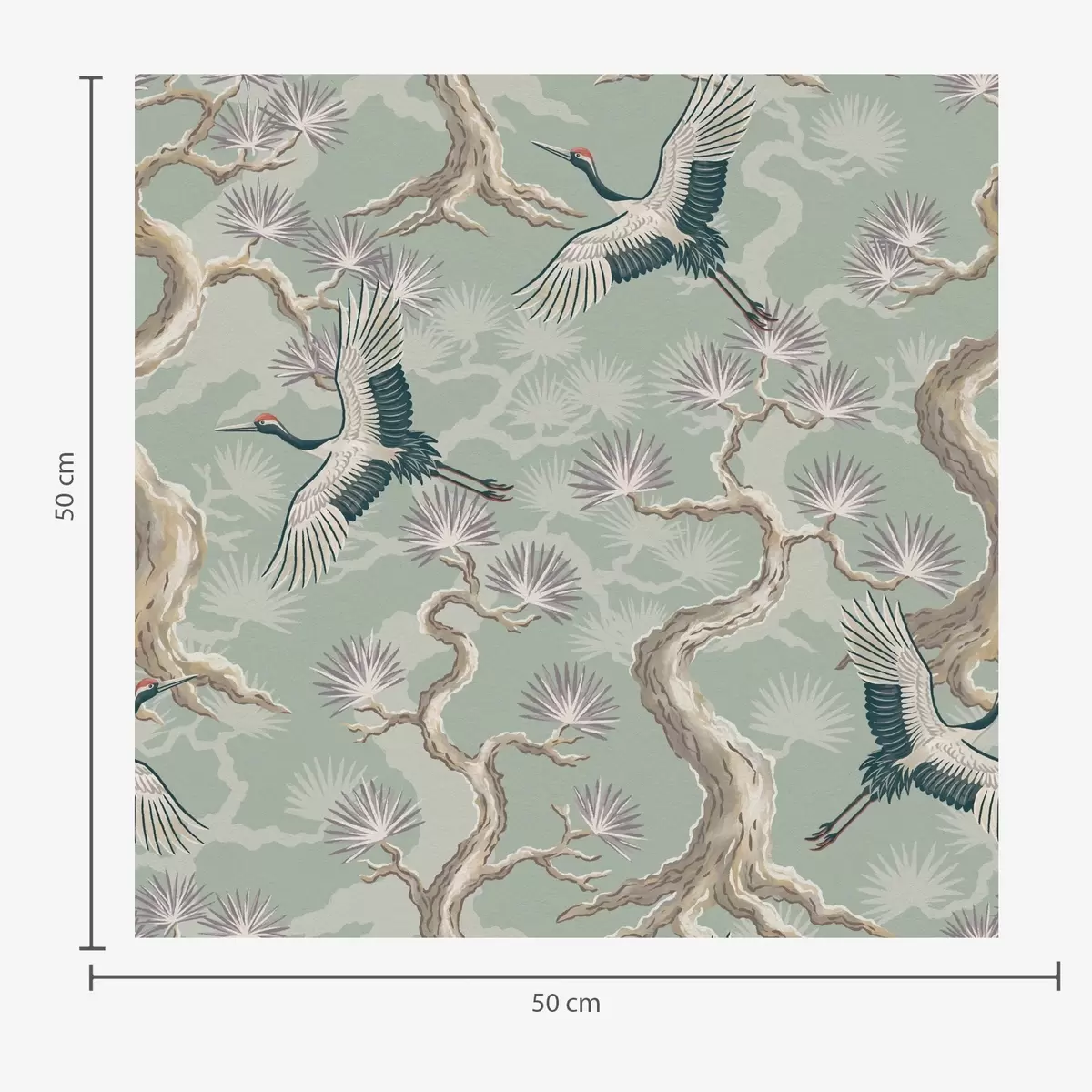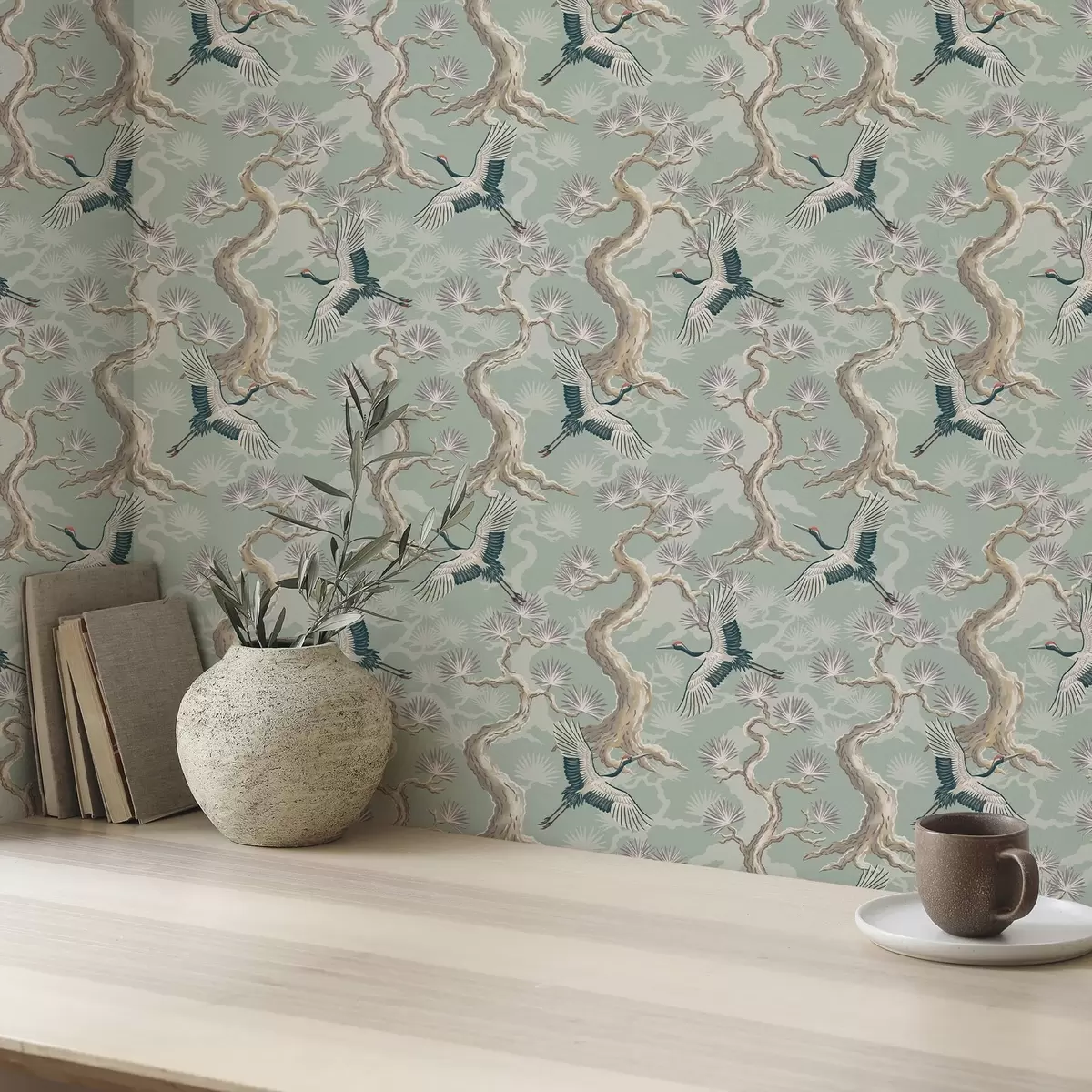 Tapet Kranar bland böjda grenar på en mjuk salviafärgad bakgrund Nr. a01023