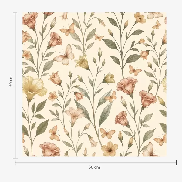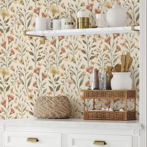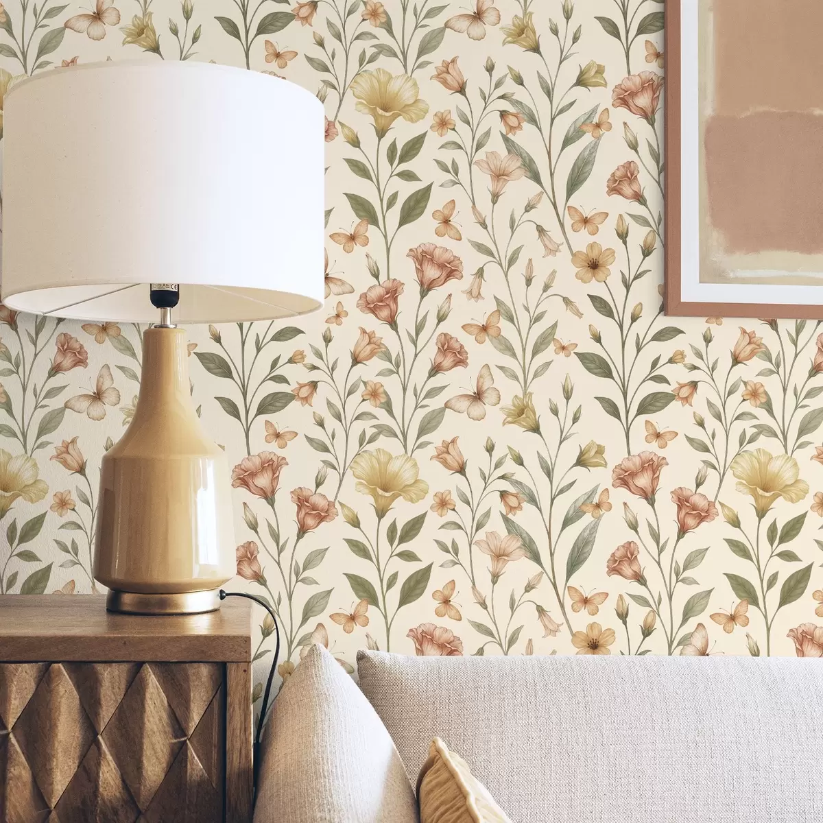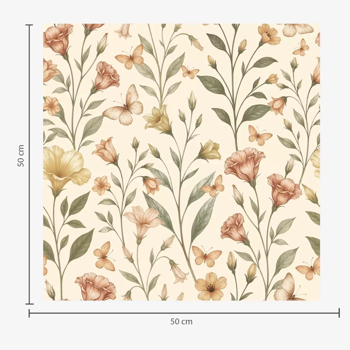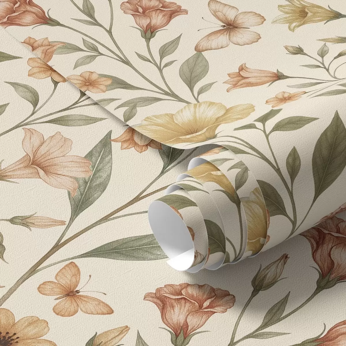 Tapet Delikata persikablommor och fjärilar på en varm krämfärgad bakgrund Nr. a01026