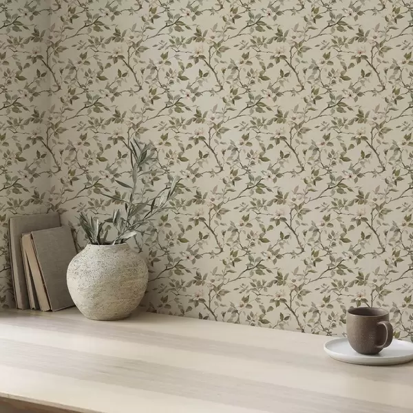 Tapet Lätta grenar med små krämfärgade blommor och gröna blad Nr. a01028
