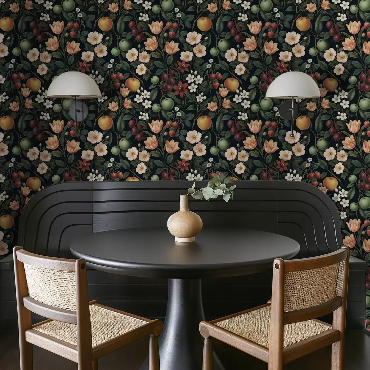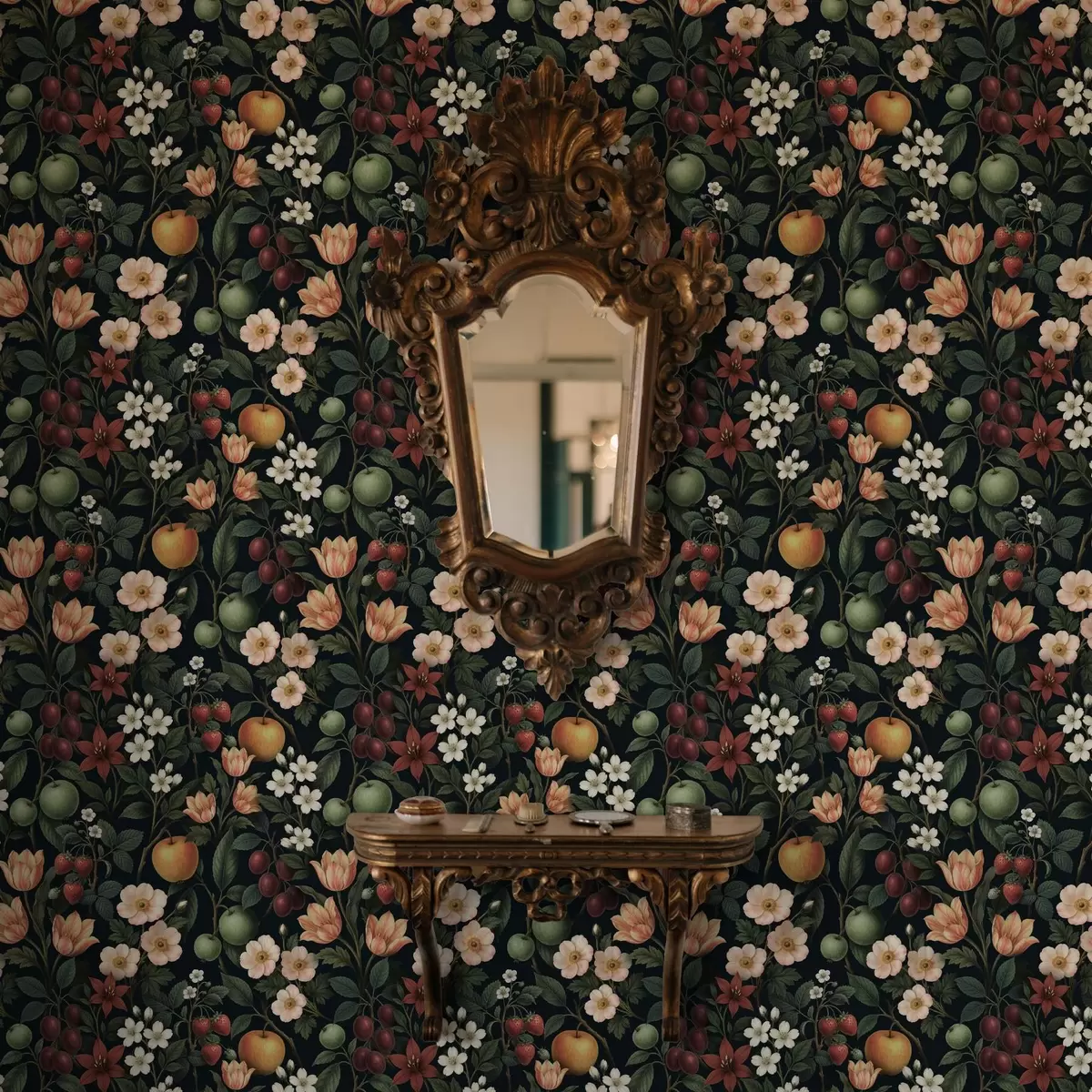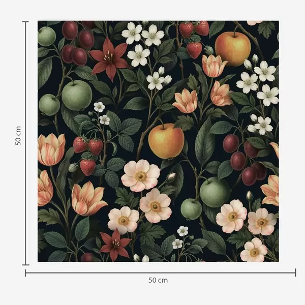 Tapet Mörk trädgård med blommor, mogna äpplen och bär Nr. a01034