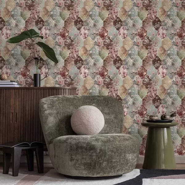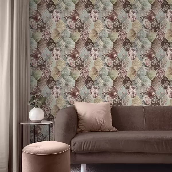 Tapet Lapptäcke av blommiga paneler och slitna mönstrade kakelplattor Nr. a01038