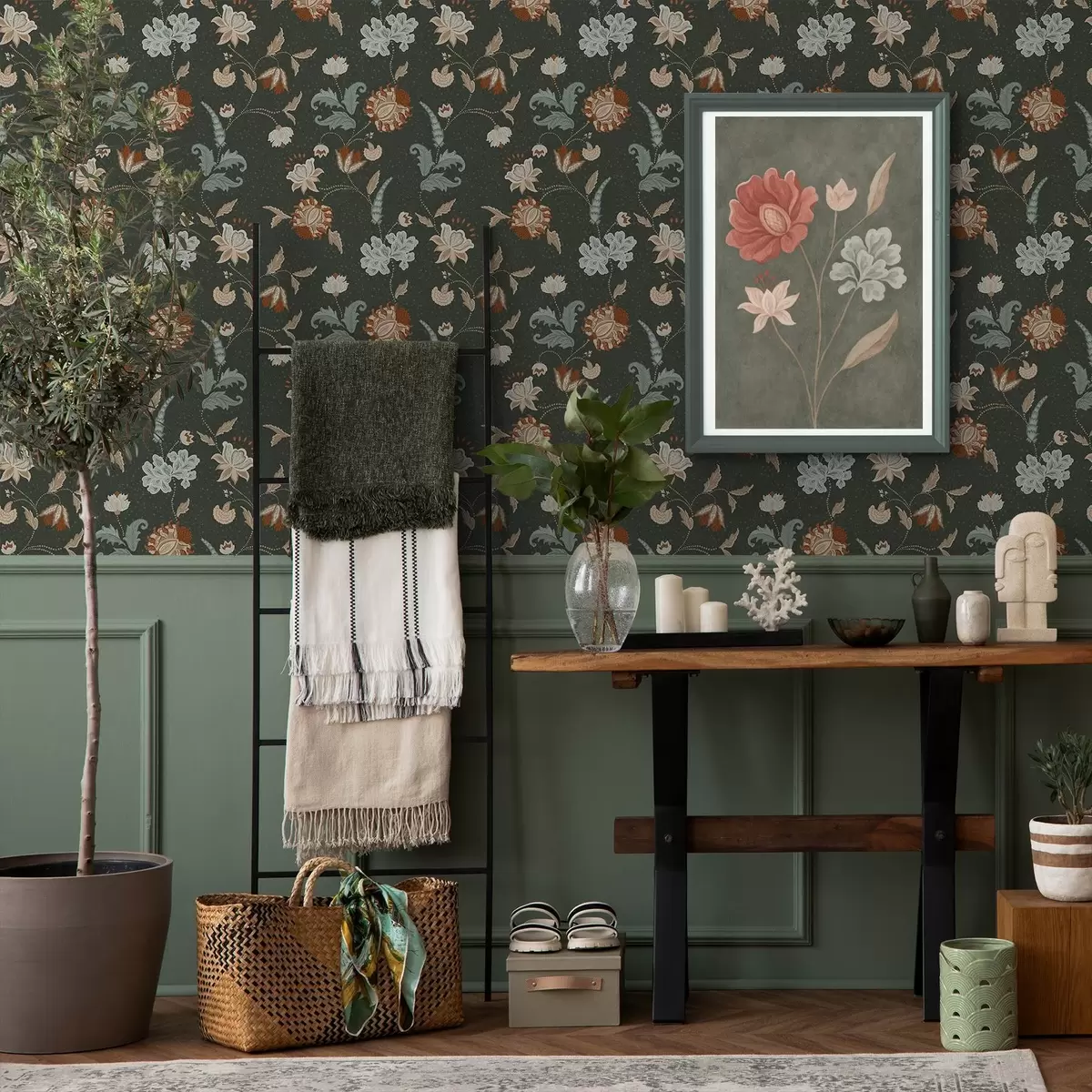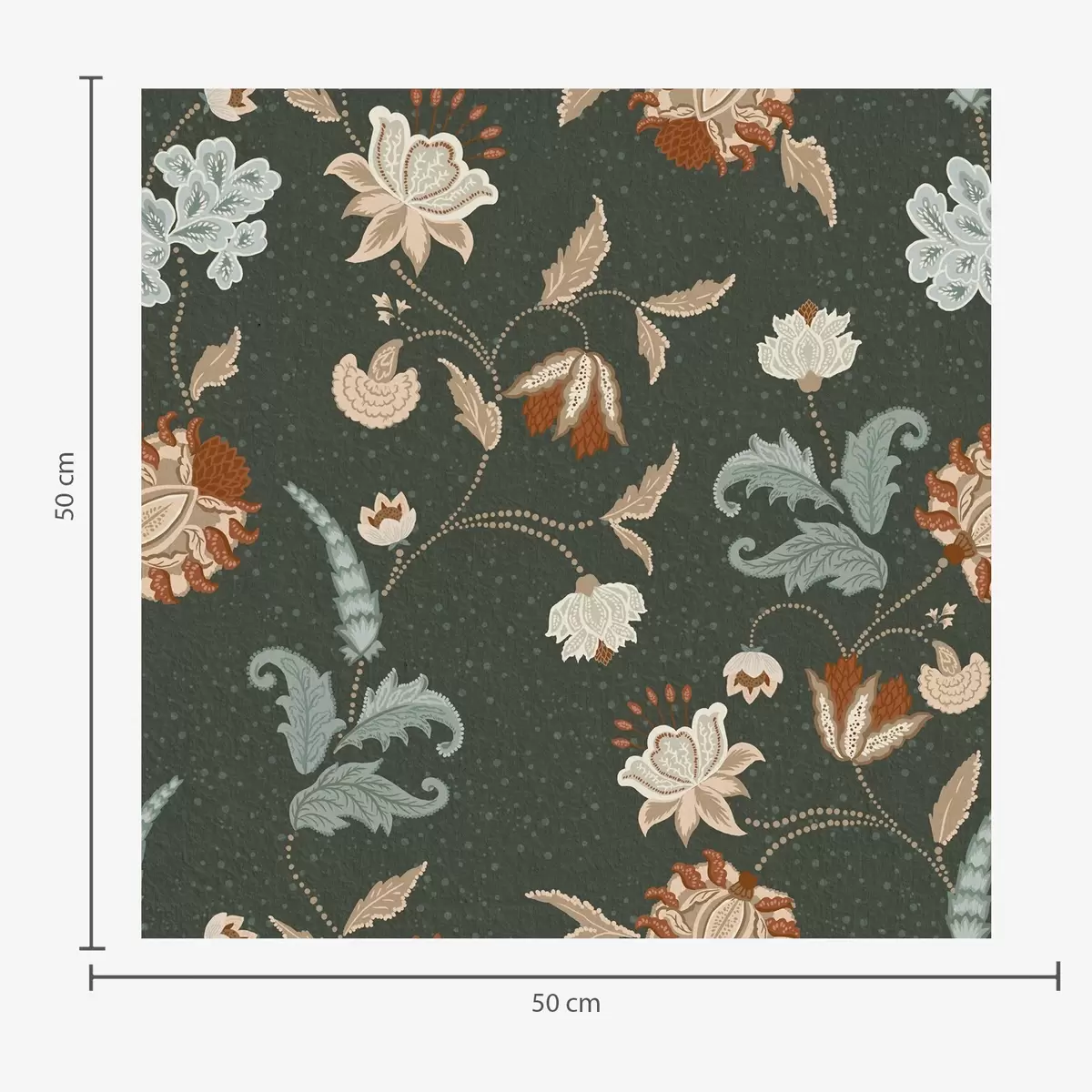 Tapet Mörkgrön bakgrund med dekorativa blommor och blad Nr. a01086