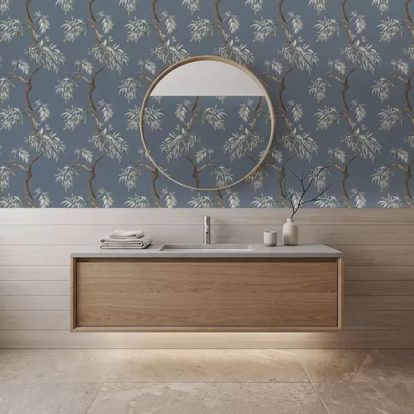Tapet Trädgren med löv på blå bakgrund Nr. a01117