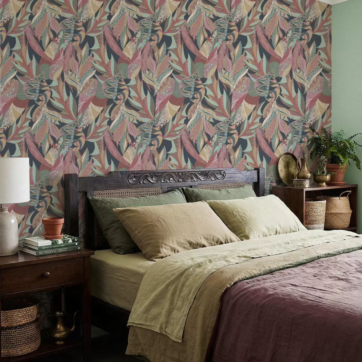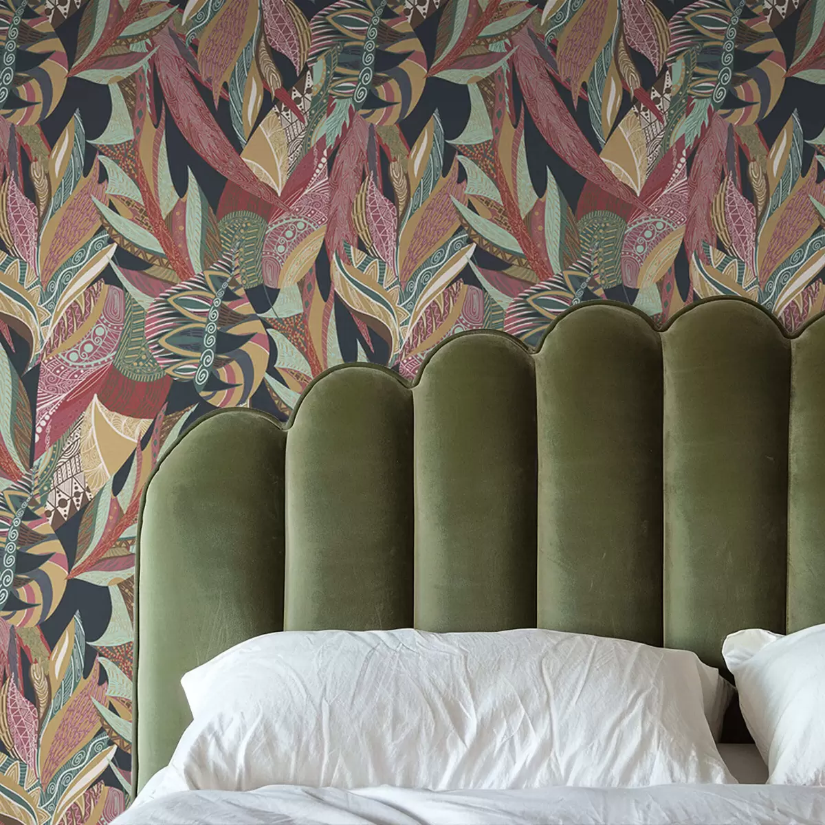 Tapet Färgglada mönstrade blad på mörk bakgrund Nr. a01120